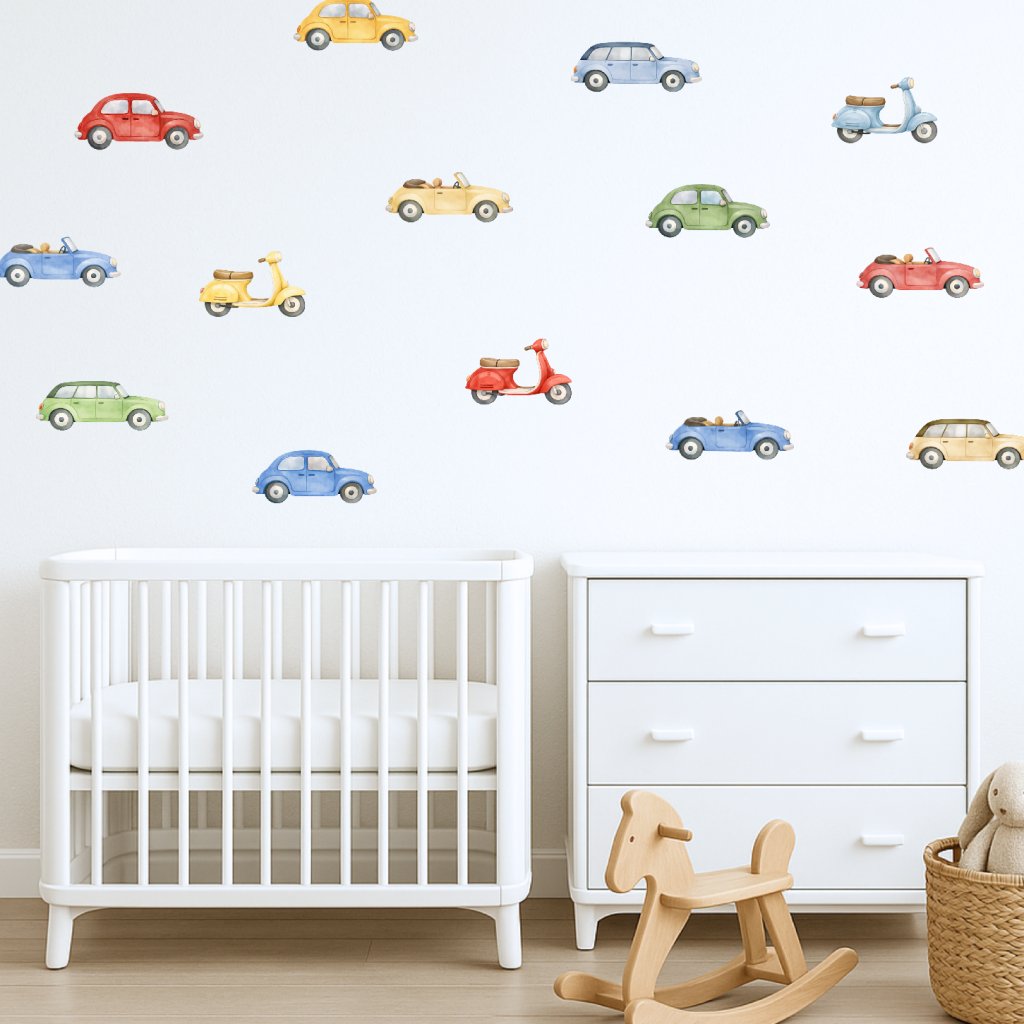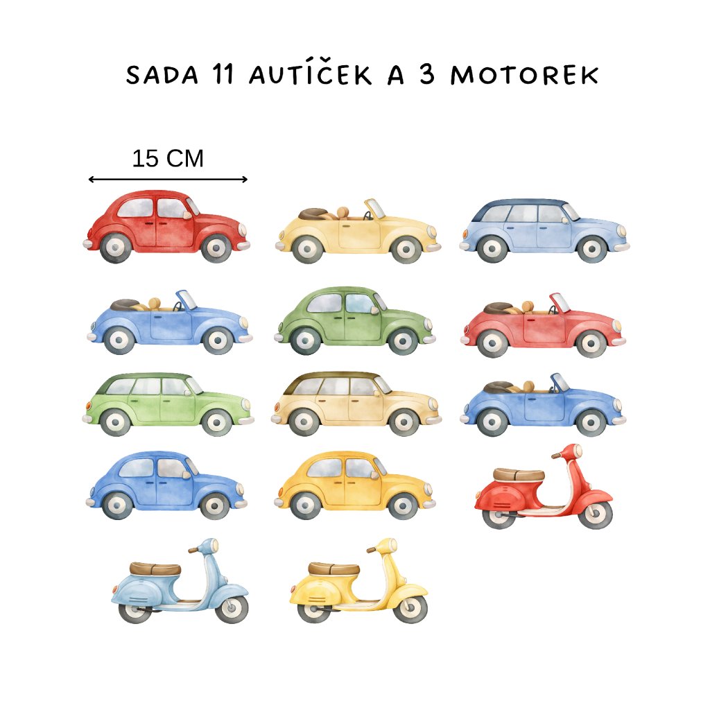 Autíčka a motorky - přemístitelné samolepky na zeď pro děti