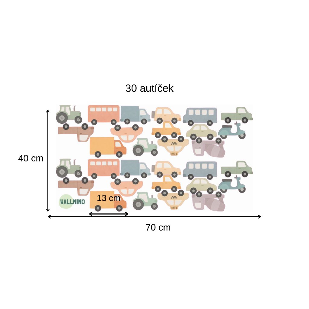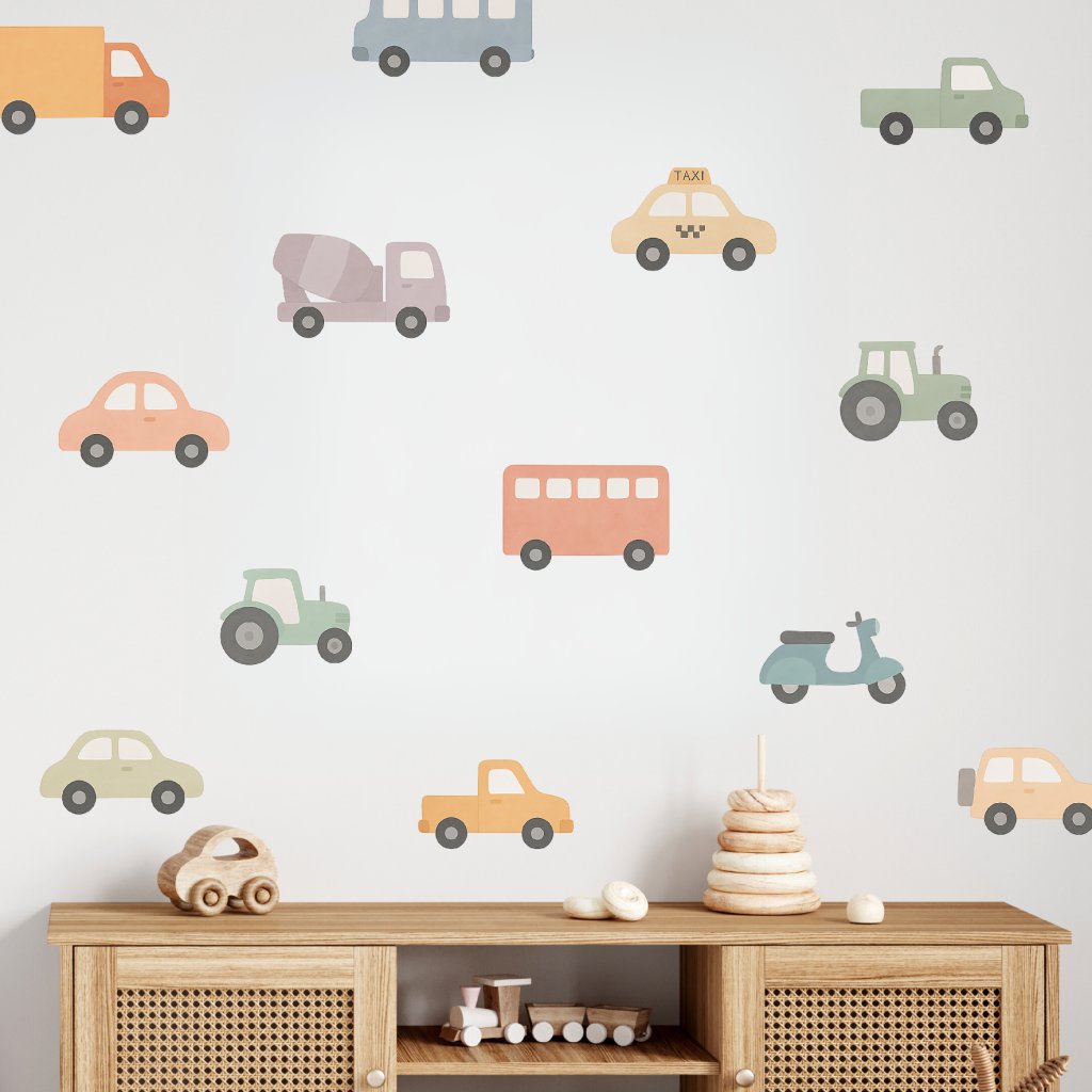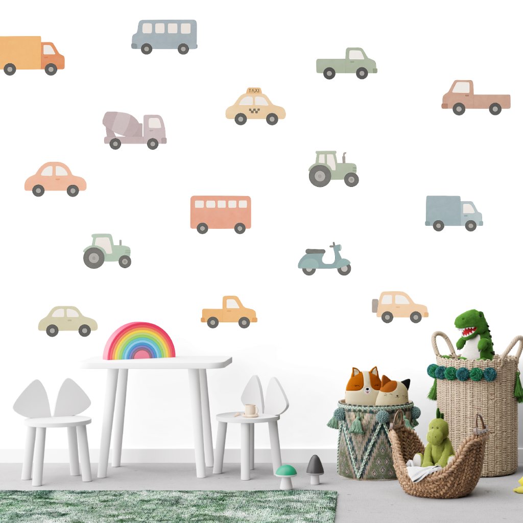 Barevná autíčka - přemístitelné dětské samolepky na zeď
