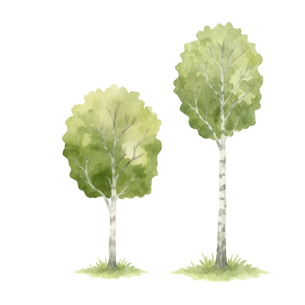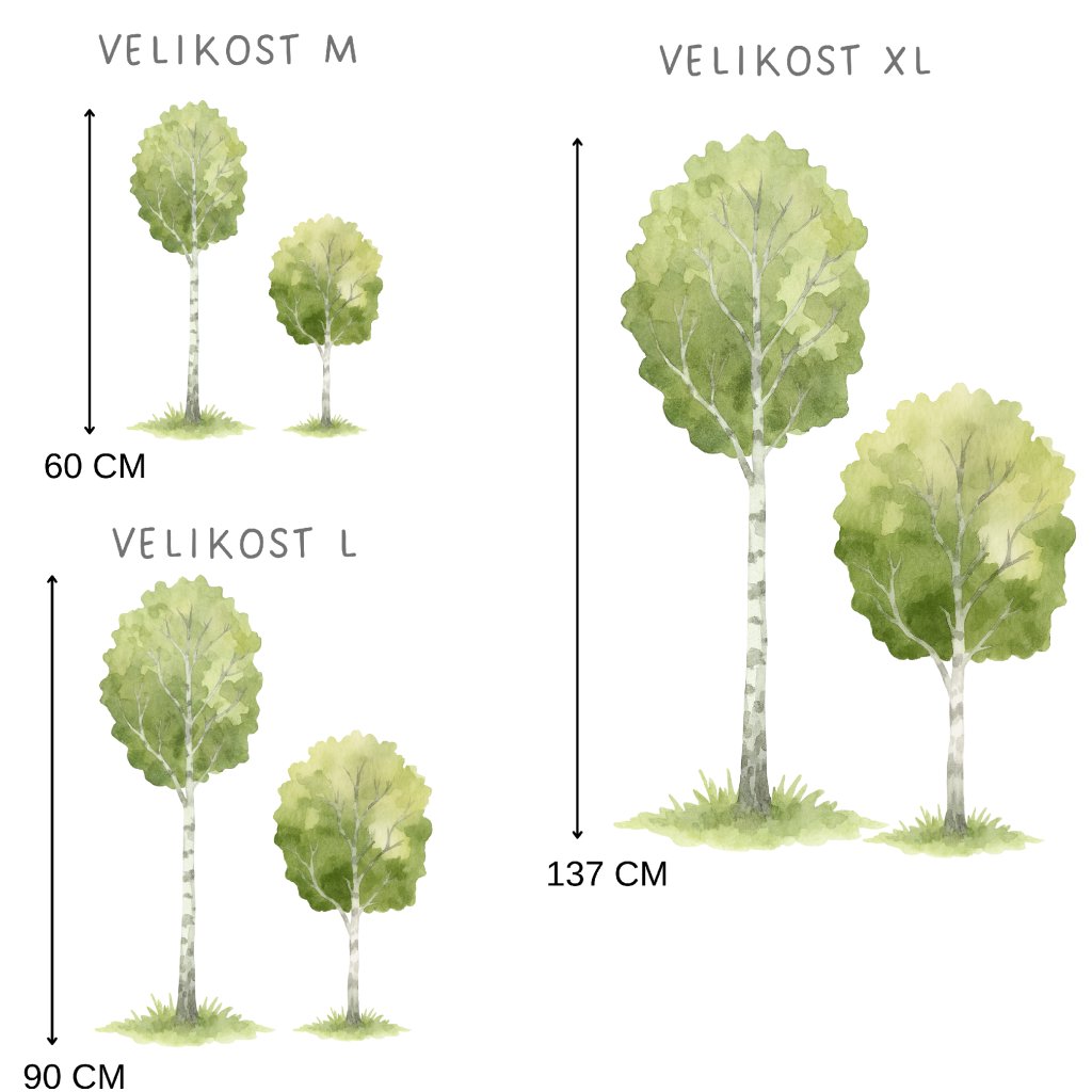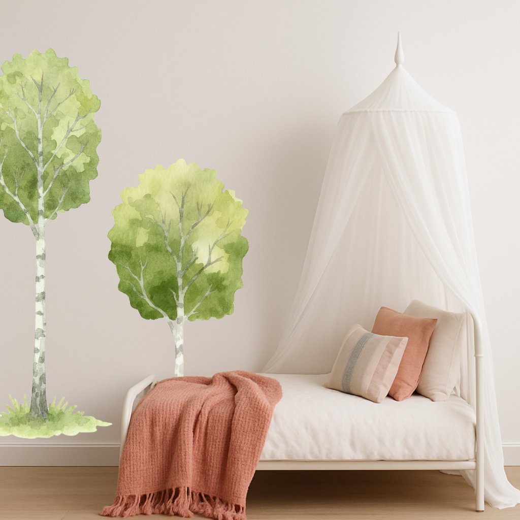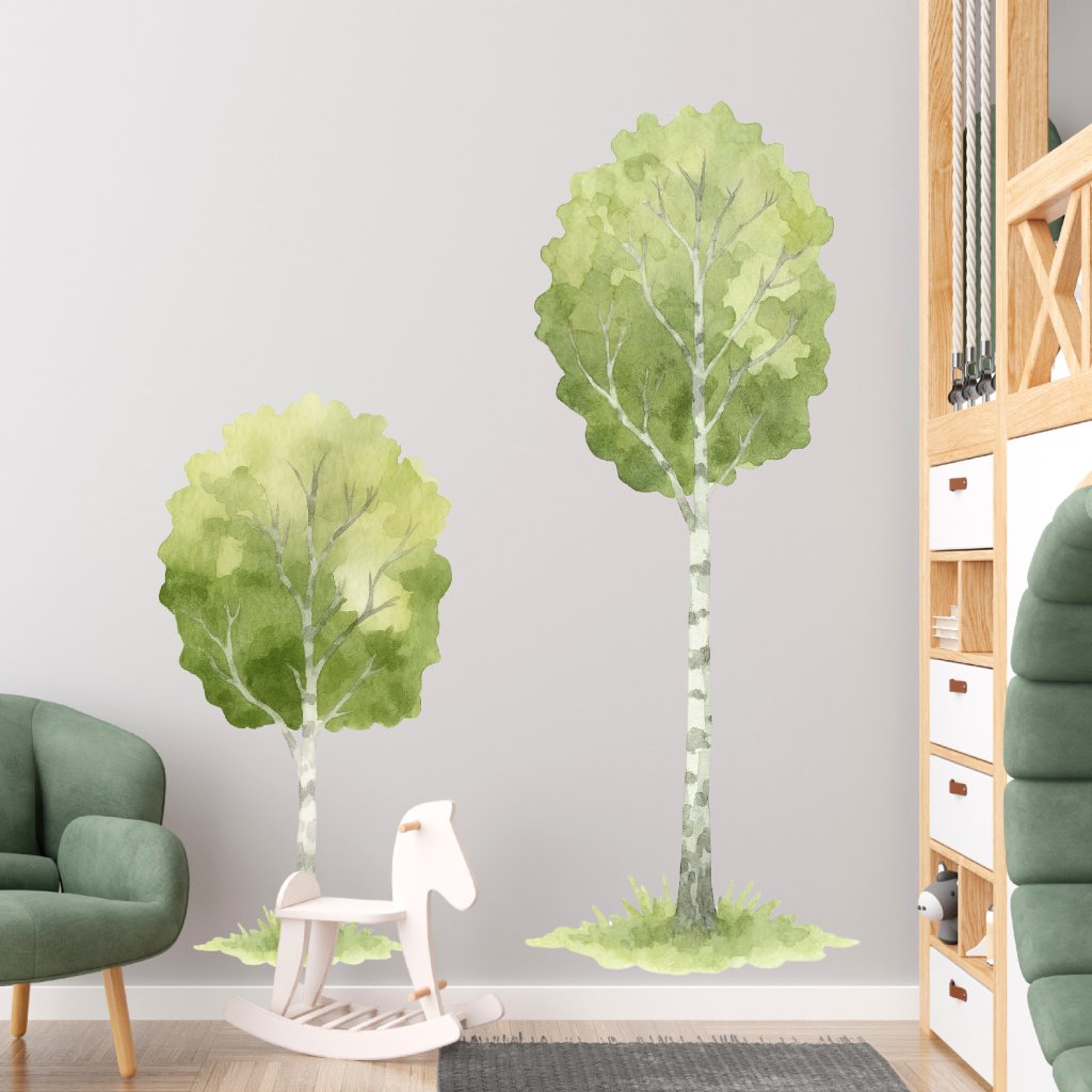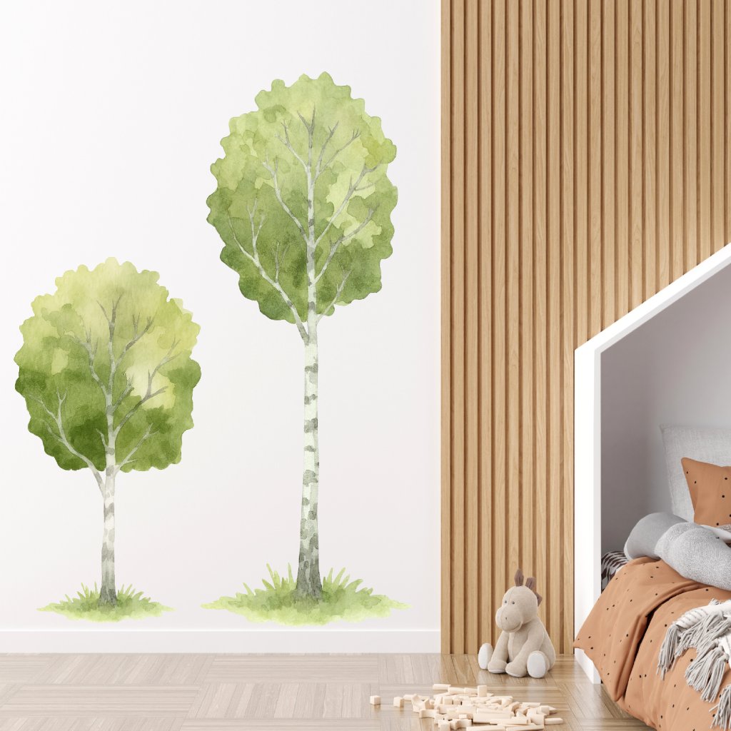Dva jemně malované břízy přinesou do dětského pokojíčku klid a dotek přírody. Jejich svěží zelené koruny vytvářejí harmonickou atmosféru, která se skvěle hodí jako doplněk k lesním zvířátkům nebo jako samostatná dekorace pro všechny malé milovníky lesa.