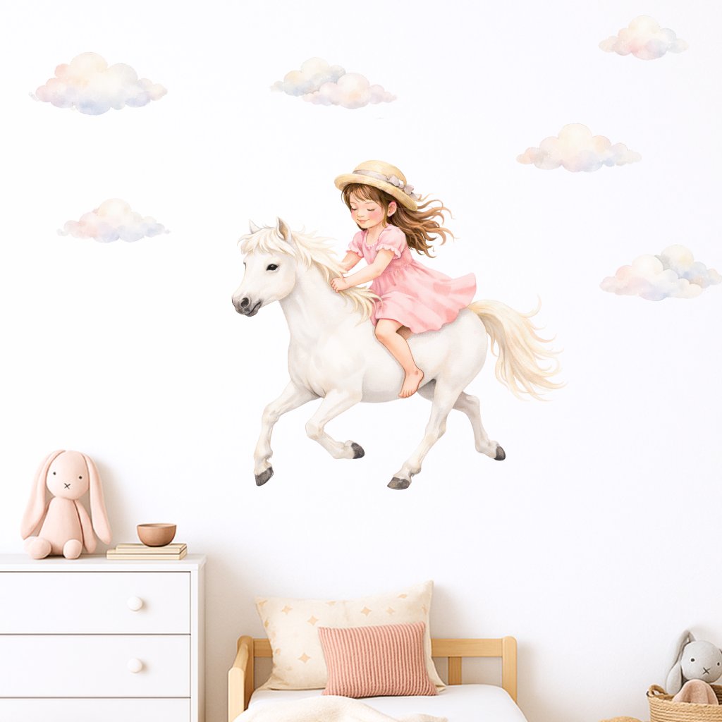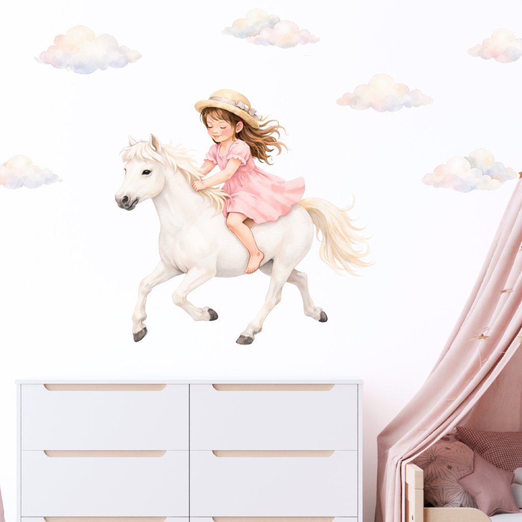Jemná samolepka s holčičkou na bílém koni vytváří pohádkovou atmosféru plnou lehkosti a snění. Krásně se hodí do dívčího pokoje a podněcuje fantazii i klidné hry.