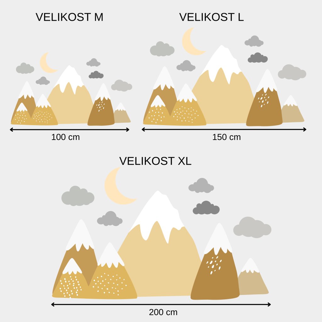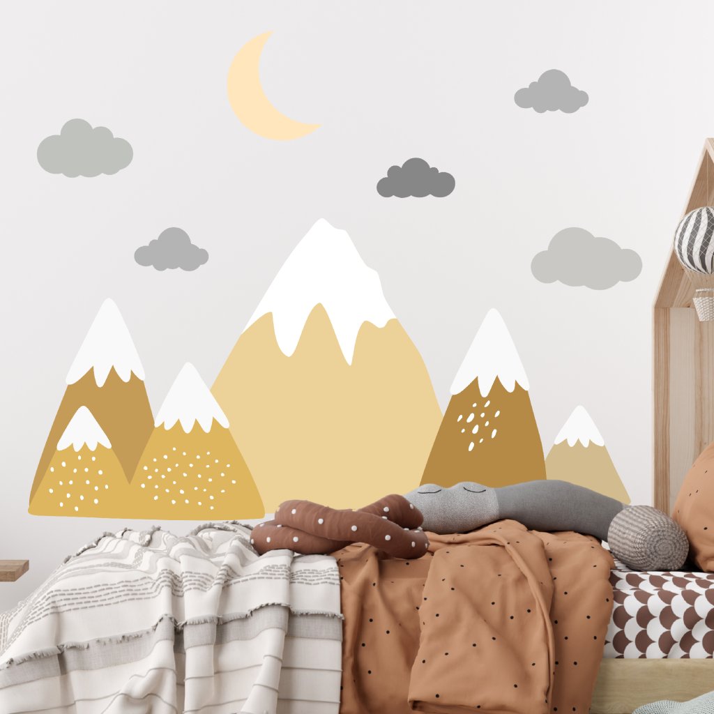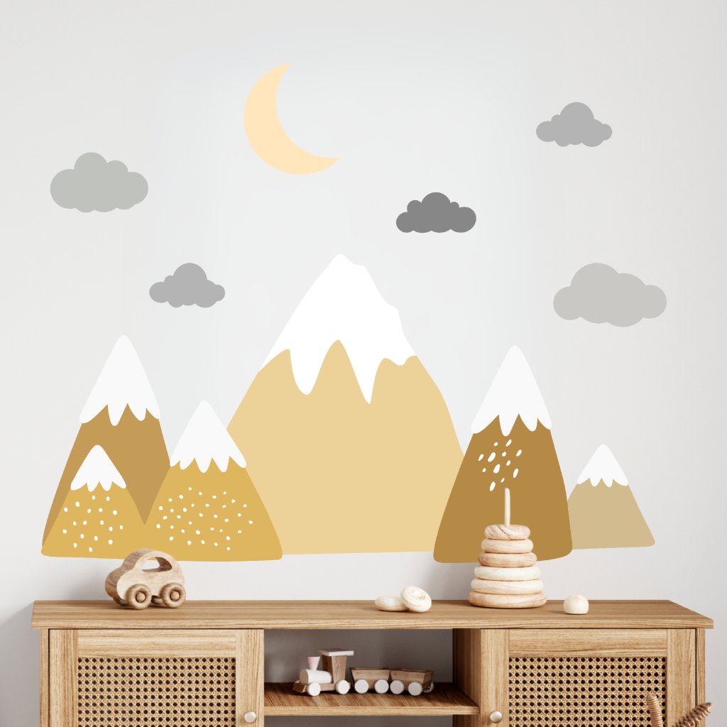 Samolepky hor v okrových tónech vnesou do dětského pokoje kousek přírody. Díky měsíci a obláčkům působí celá kompozice hřejivě a útulně – ideální dekorace k postýlce nebo hracímu koutku.