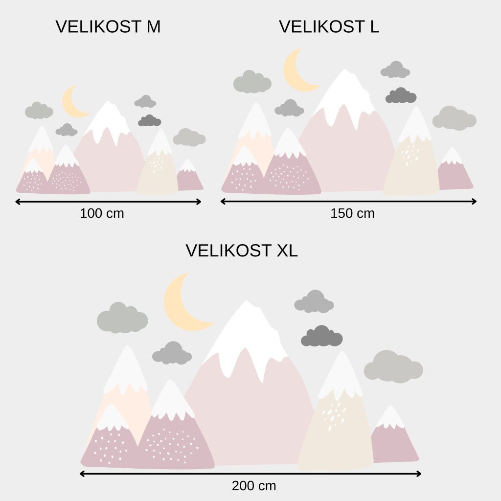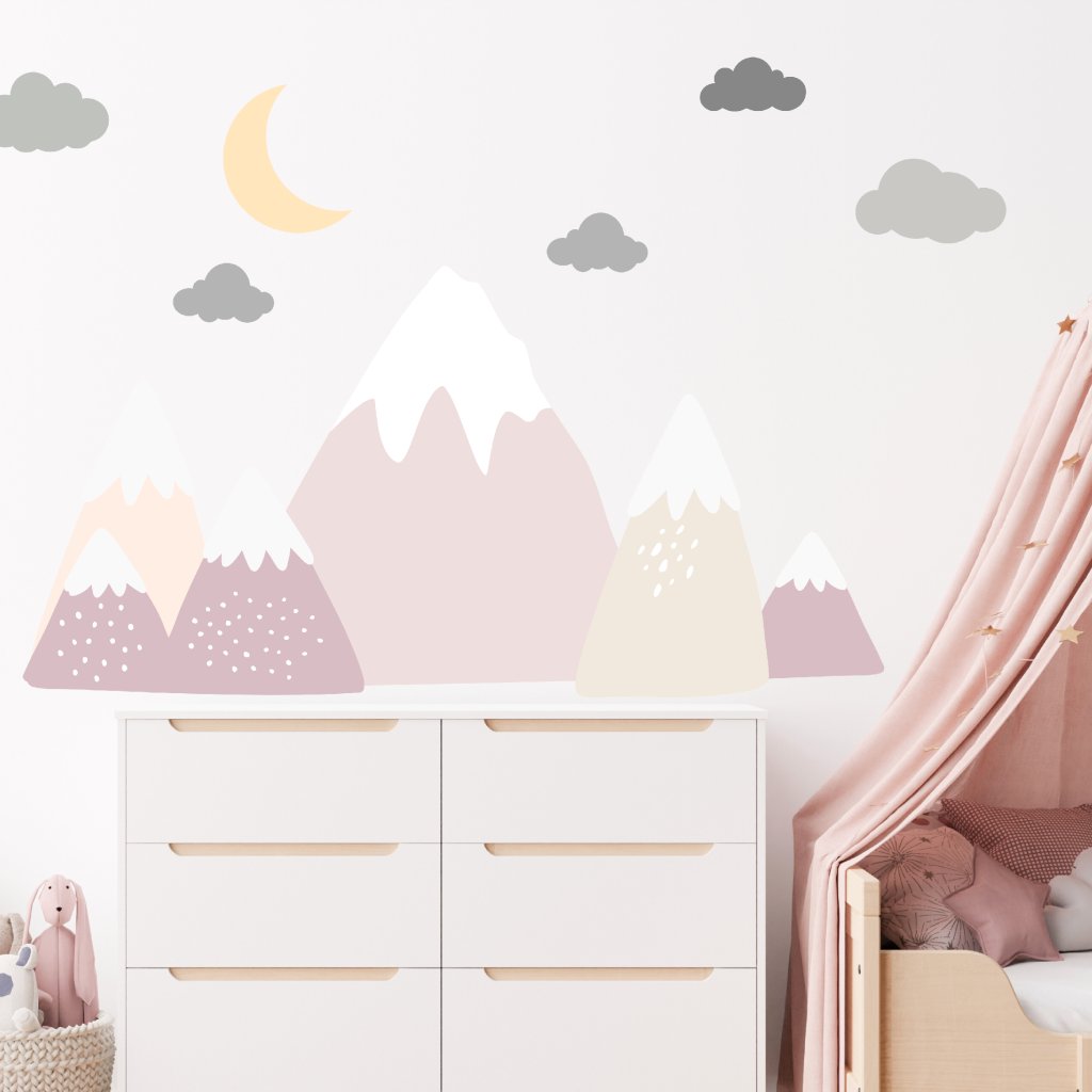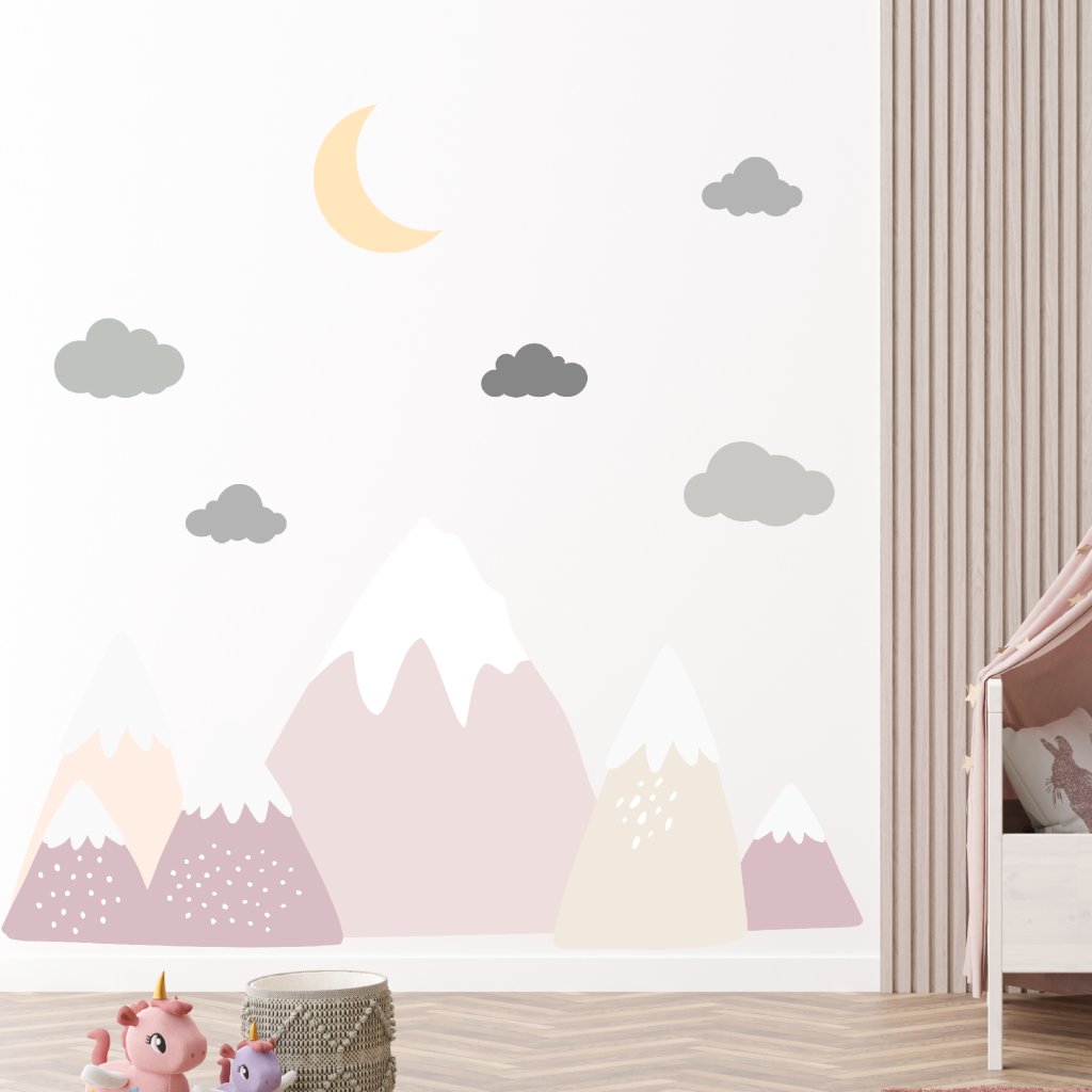 Vytvořte dětem útulný pokojíček s horami s ledovcem! Jemné růžové a neutrální hory s měsícem a obláčky působí harmonicky a dodají prostoru kouzelnou atmosféru plnou fantazie.