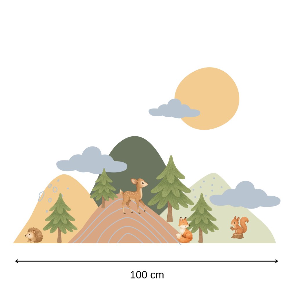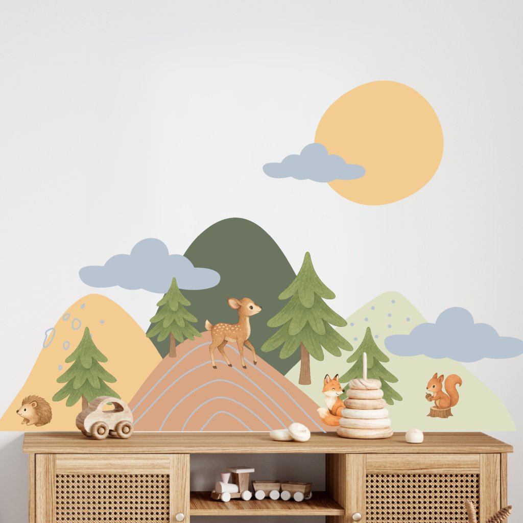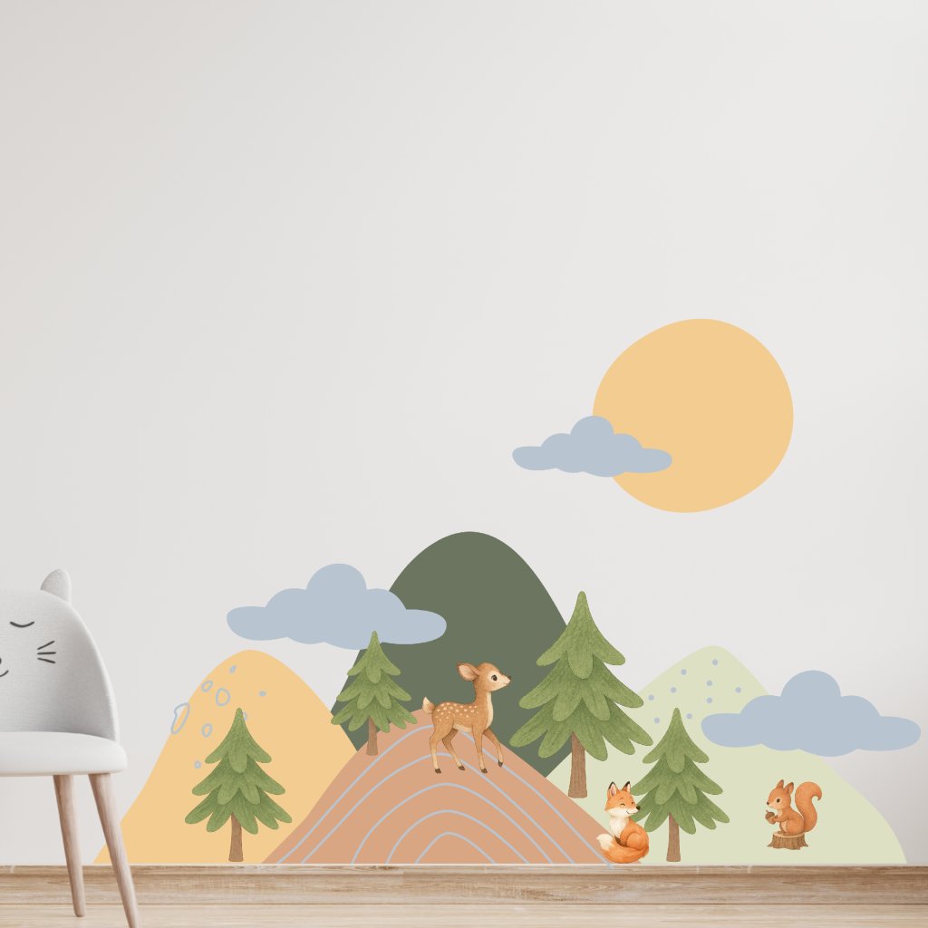 Vytvořte dětem kouzelný pokoj plný přírody! Samolepky hor s liškou, veverkou, ježečkem a srnkou doplněné o stromy, slunce a obláčky dodají pokojíčku hravou i uklidňující atmosféru.