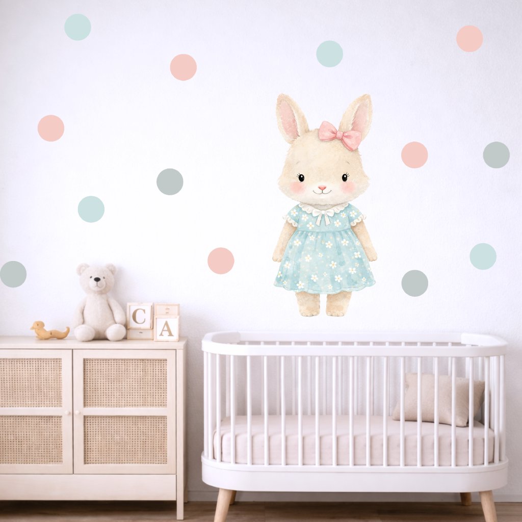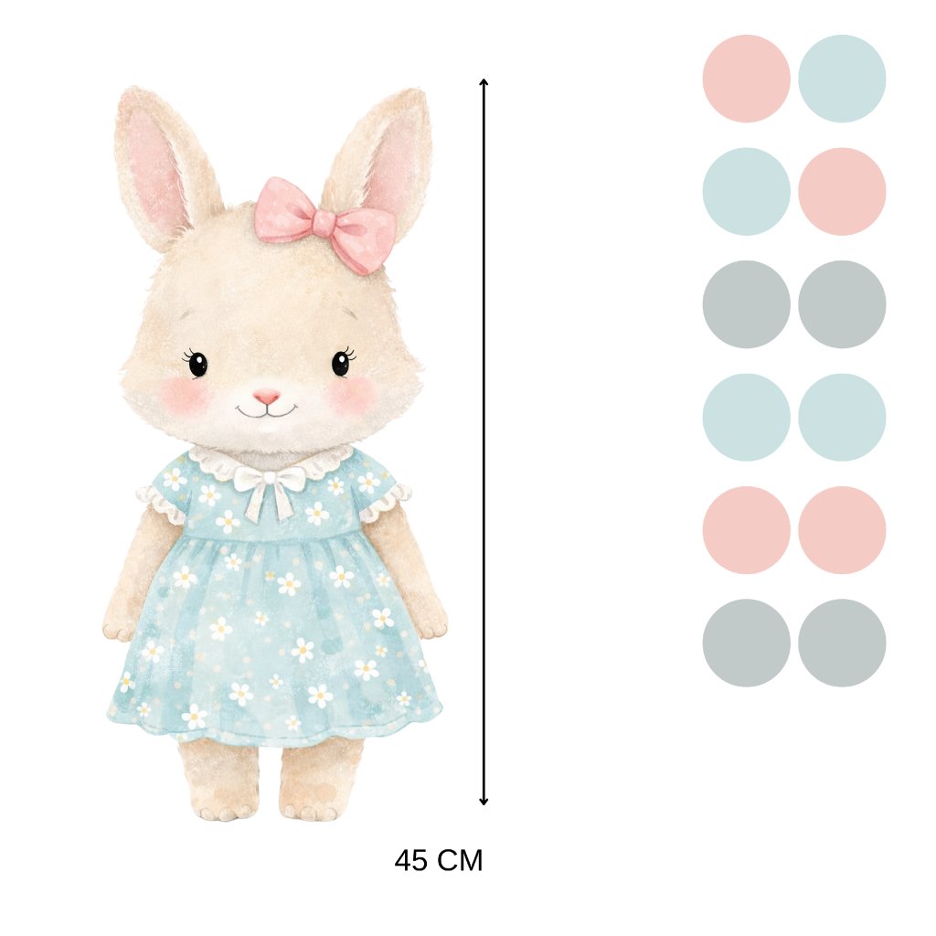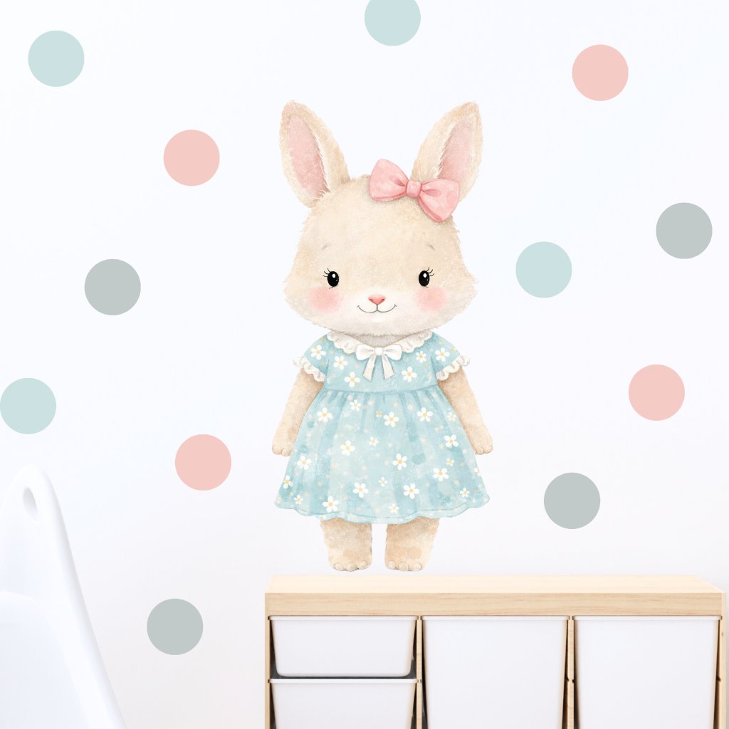Vyčarujte v pokojíčku něžnou a veselou atmosféru s motivem roztomilého králíčka v modrých šatičkách a pastelových puntíků. Samolepka na zeď je ideální do dívčího pokojíčku pro malé milovnice zvířátek a jemných motivů.