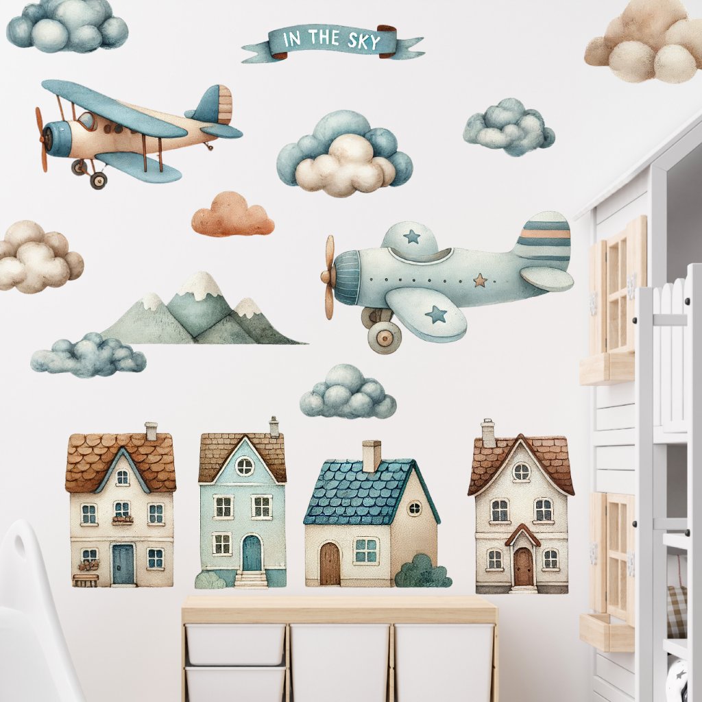 Letadla a domečky - přelepitelné samolepky na zeď