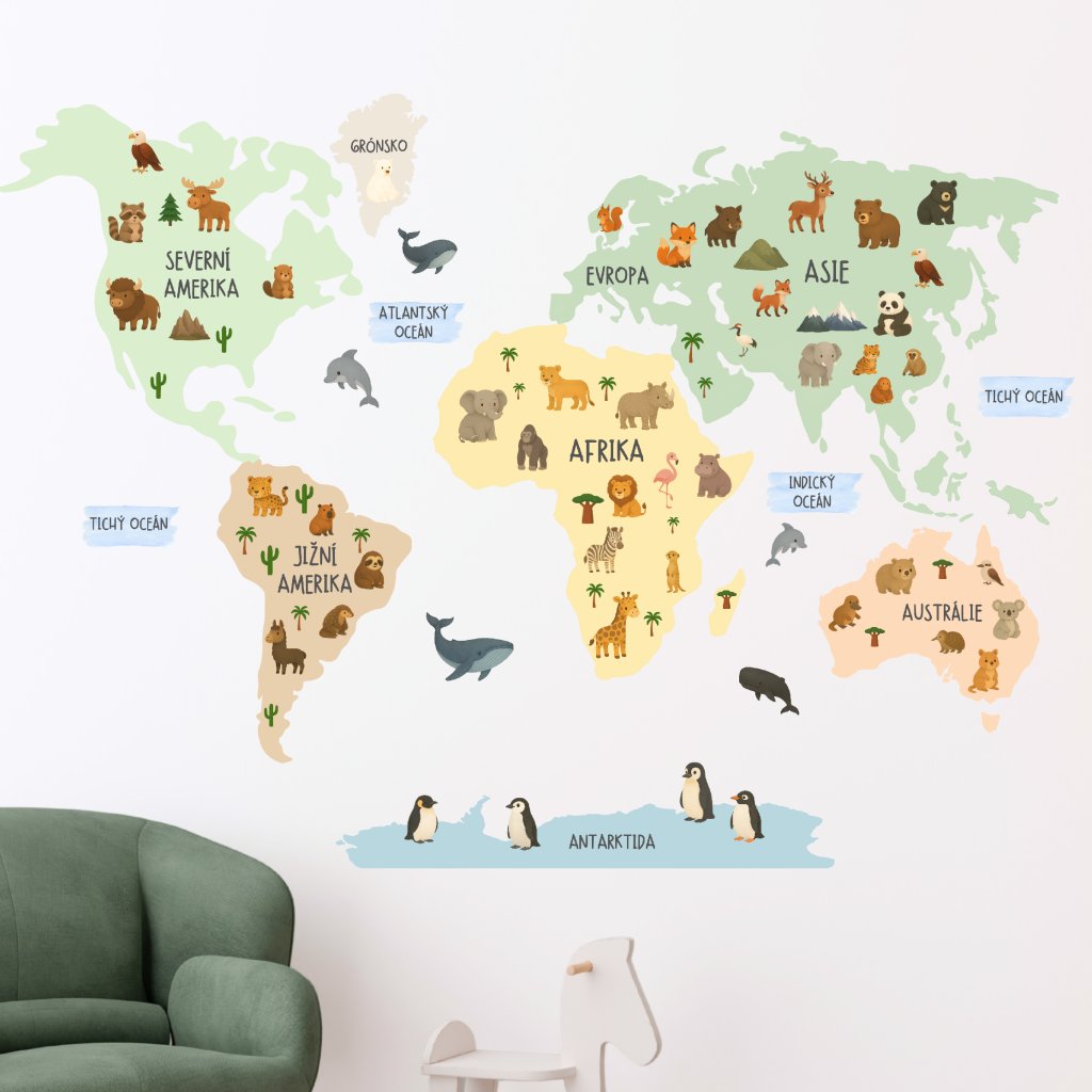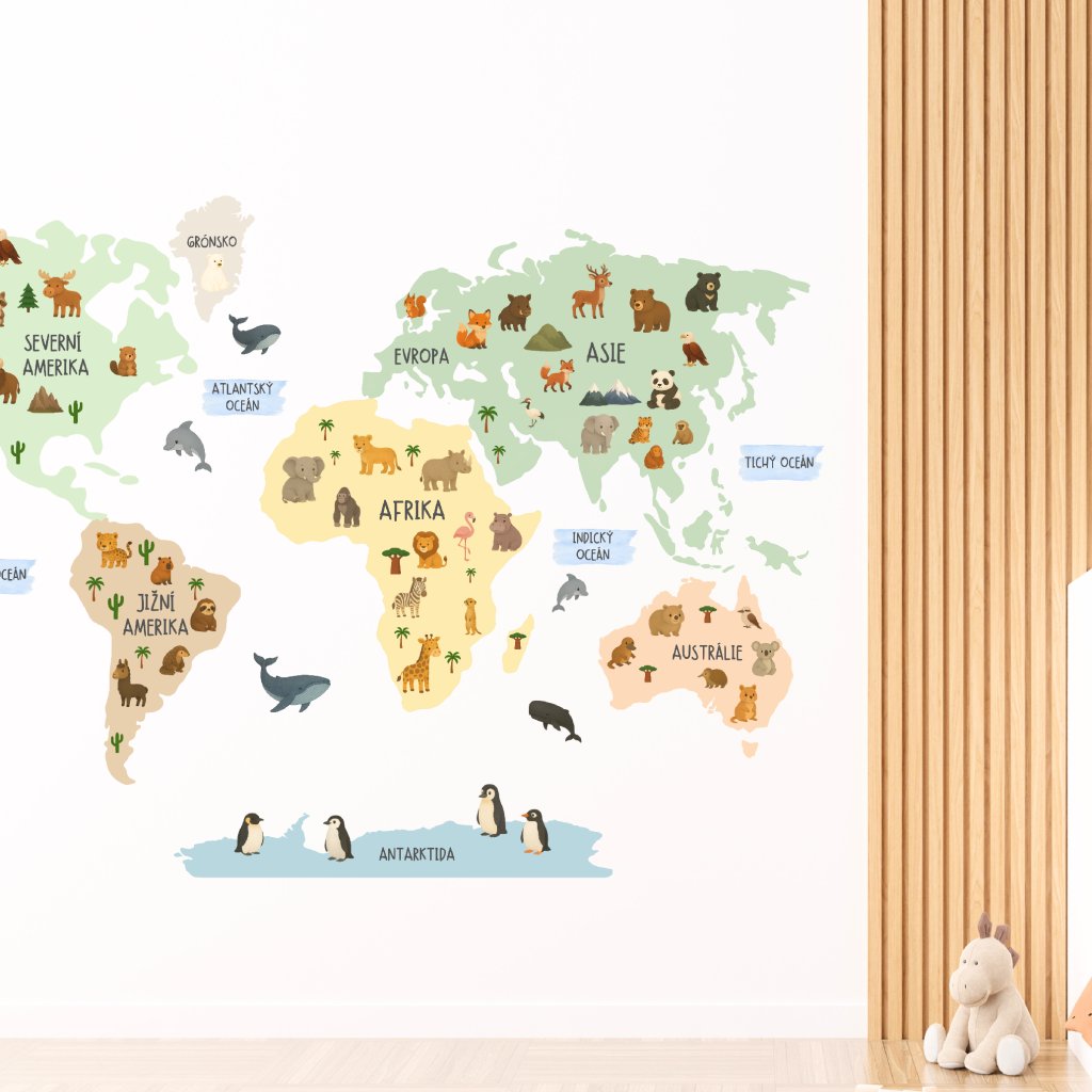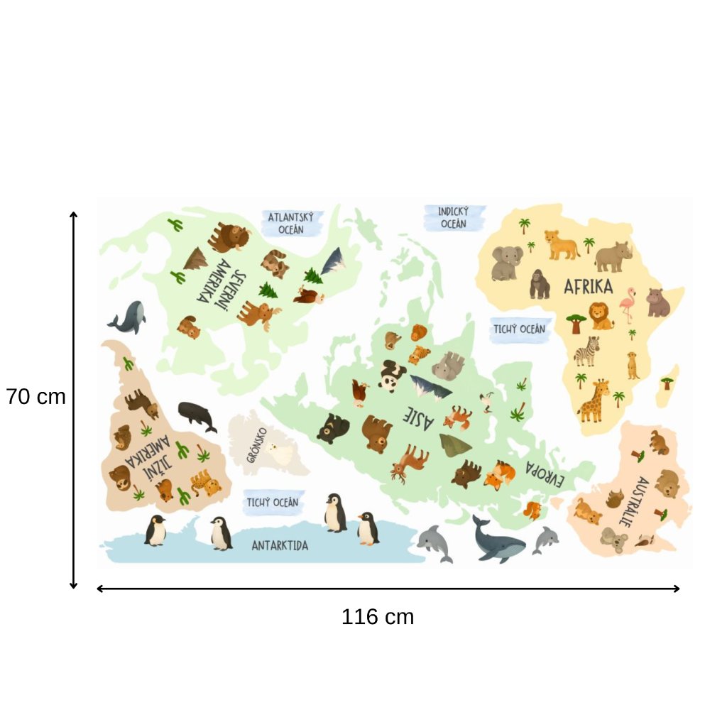 Mapa světa se zvířátky - dětské samolepky na zeď