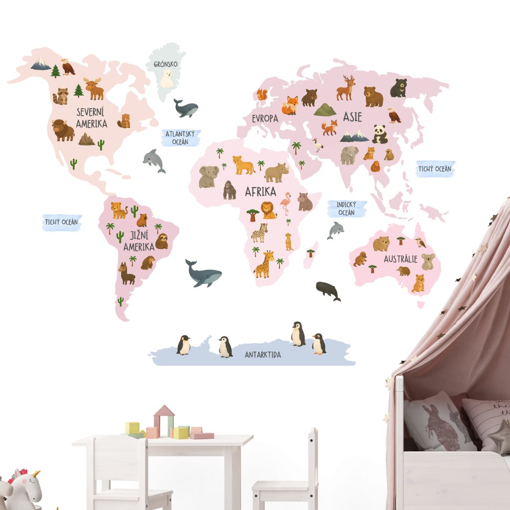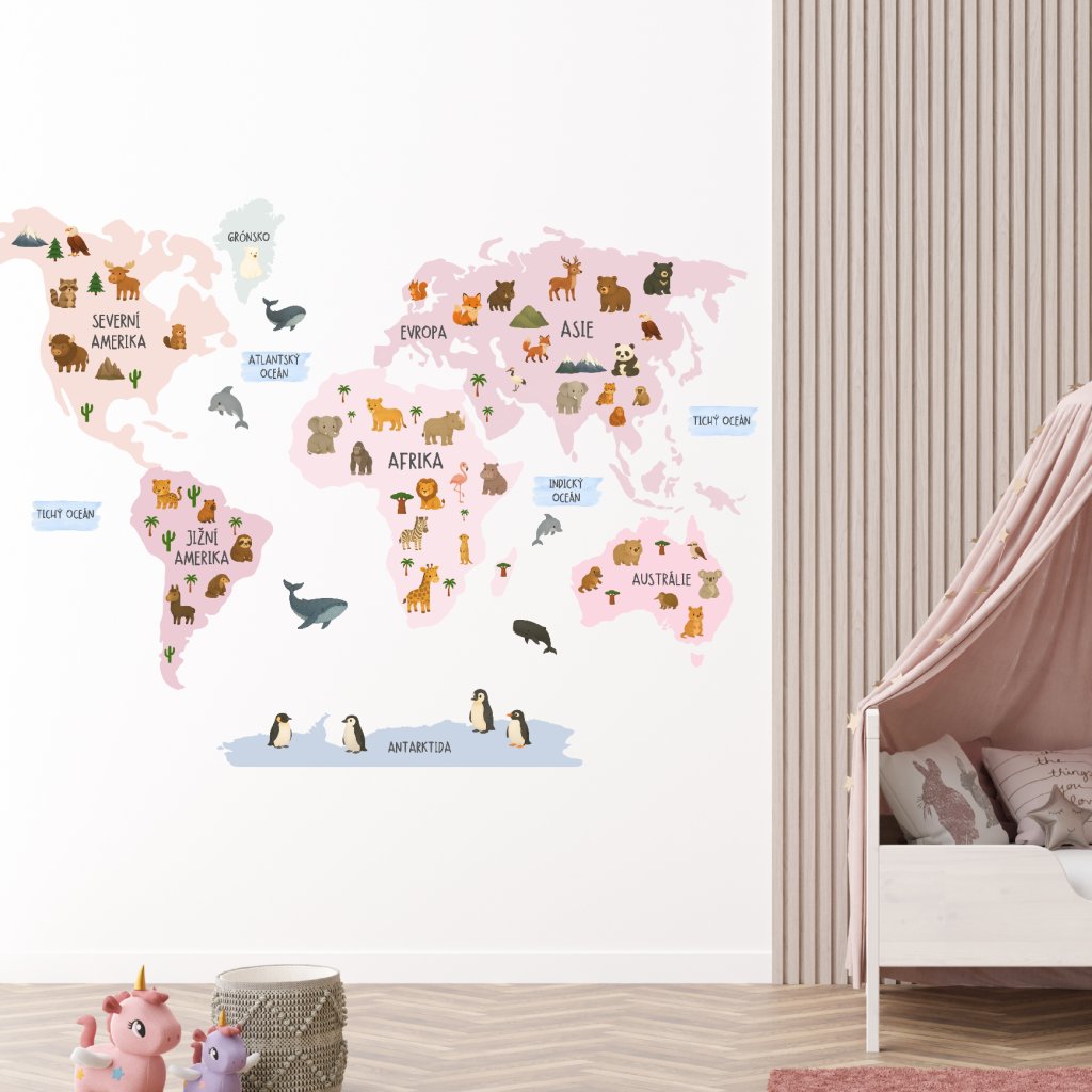 Mapa světa se zvířátky - růžová - dětské samolepky na zeď