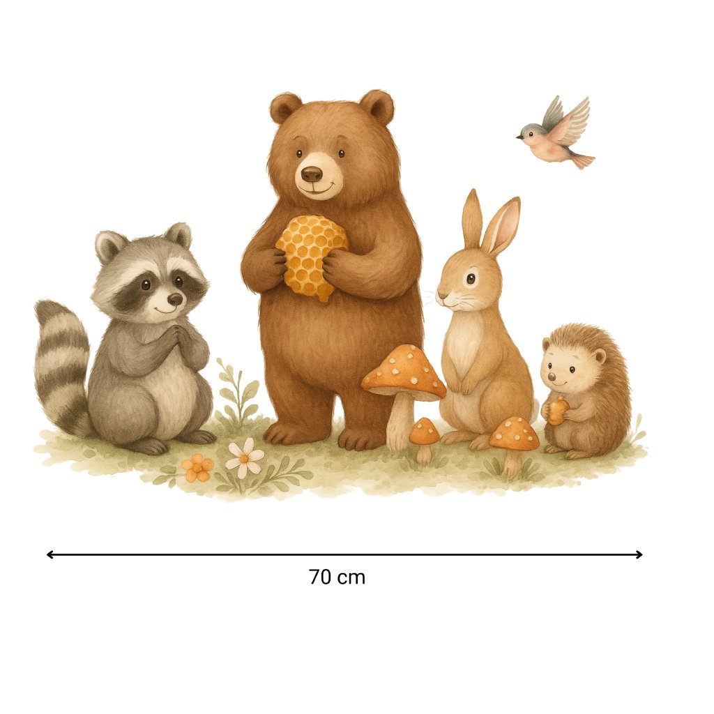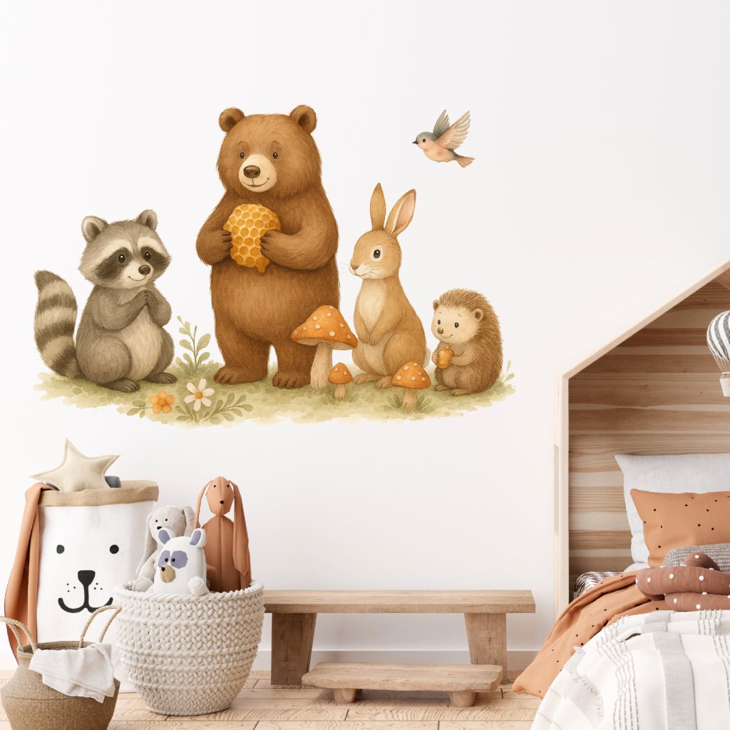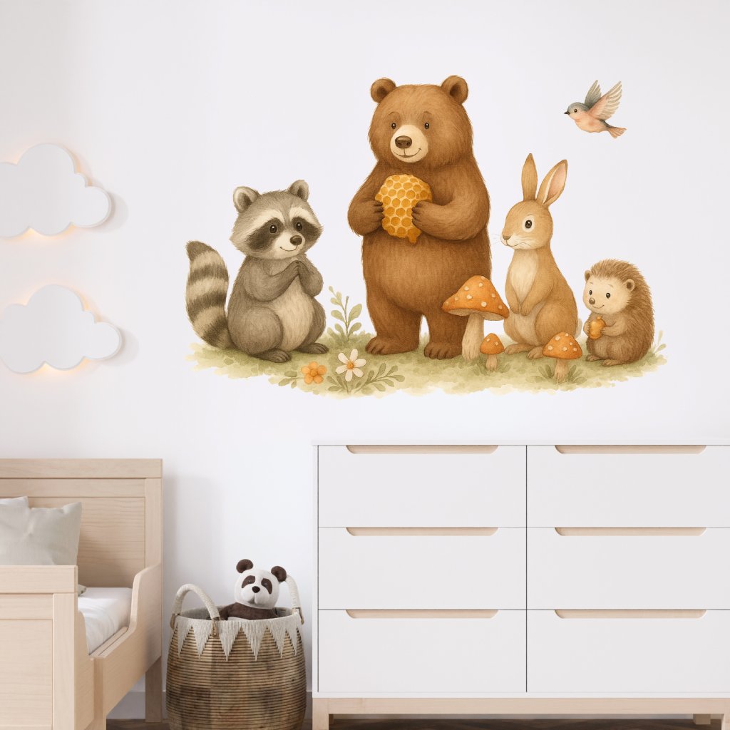 Medvěd s kamarády - přelepitelné dětské samolepky na zeď