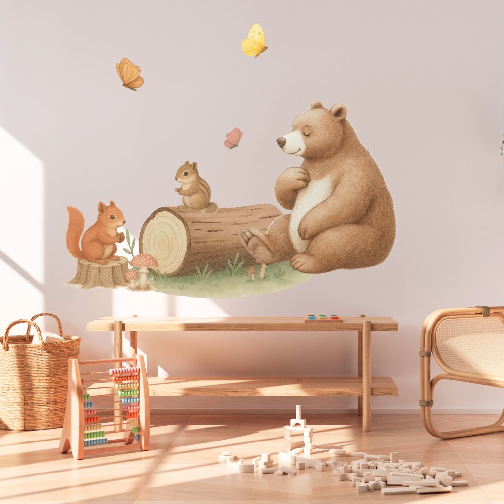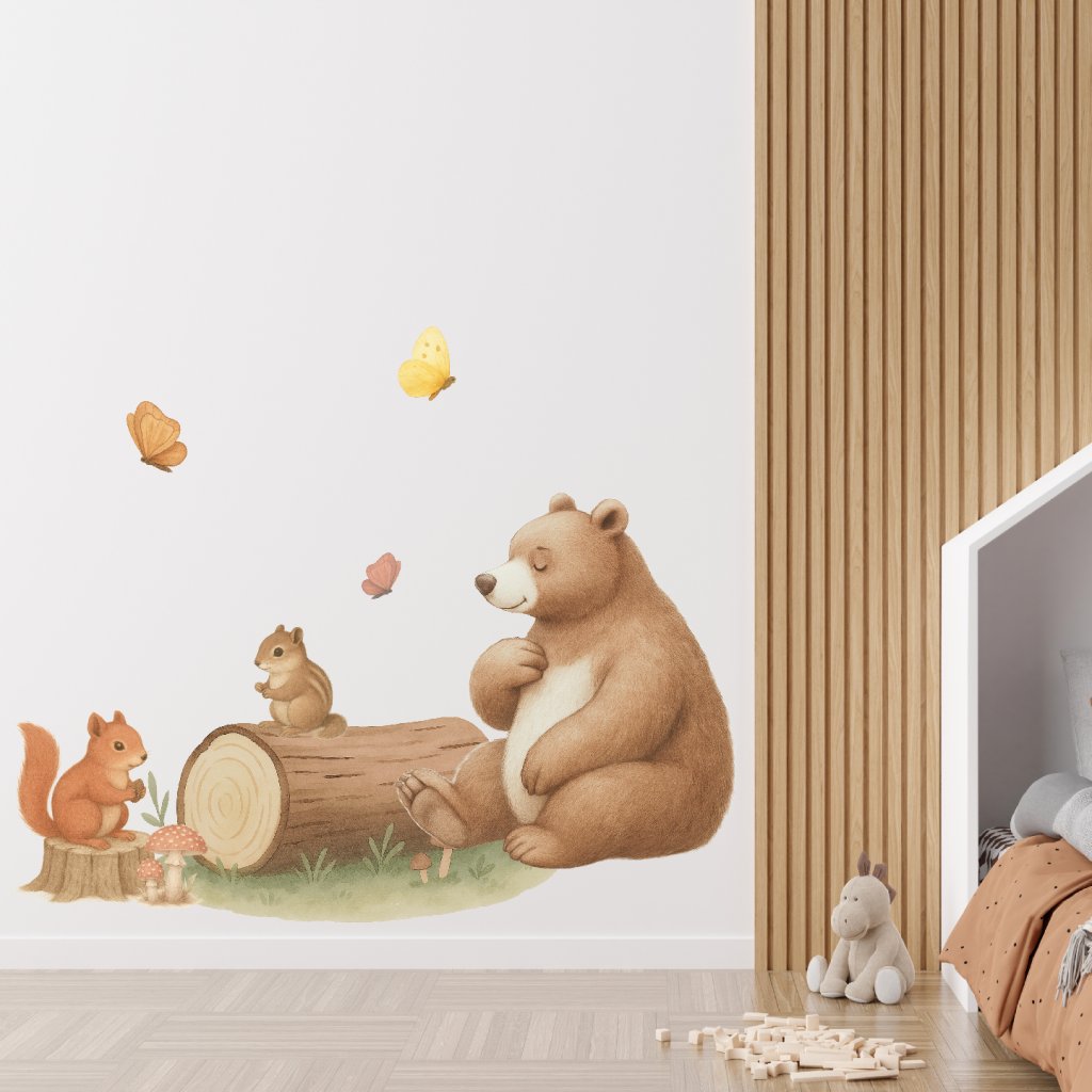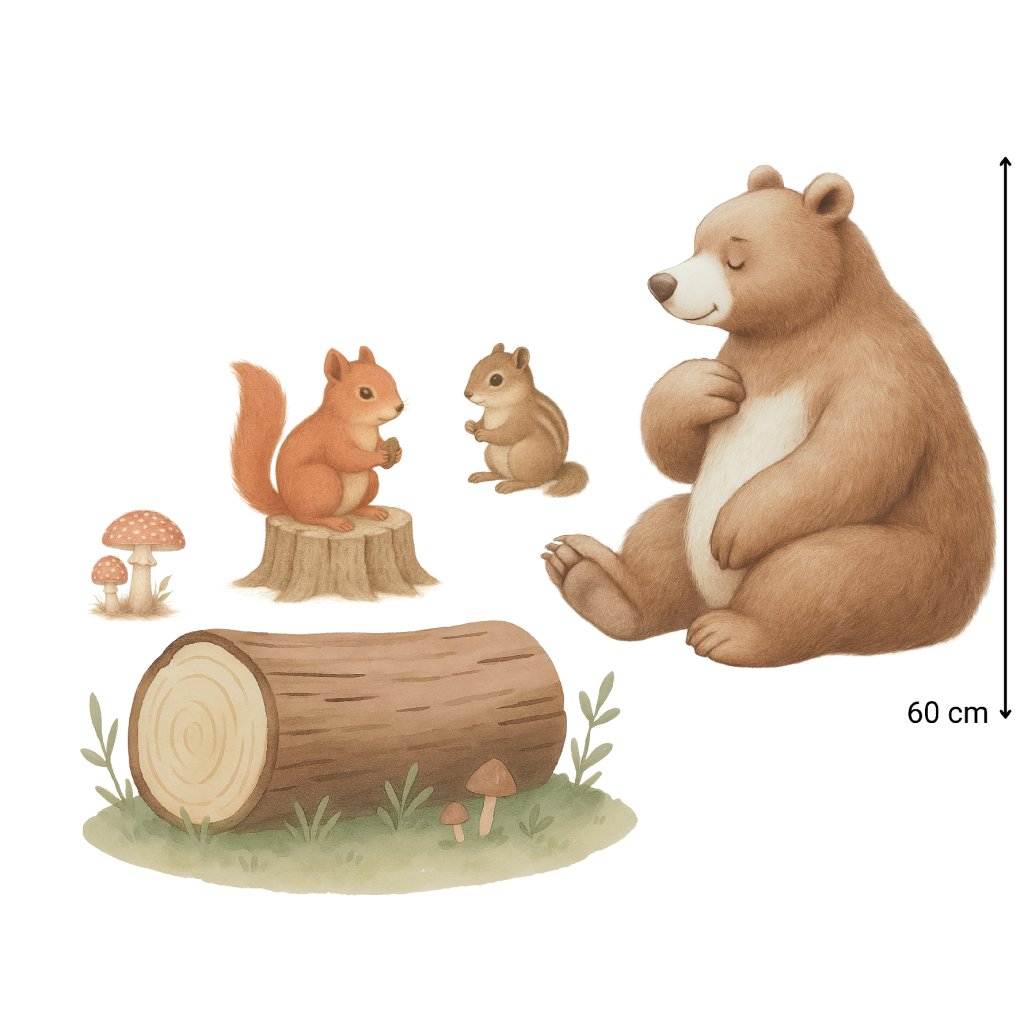 Medvídek a zvířátka - s pařezem - přelepitelné dětské samolepky na zeď
