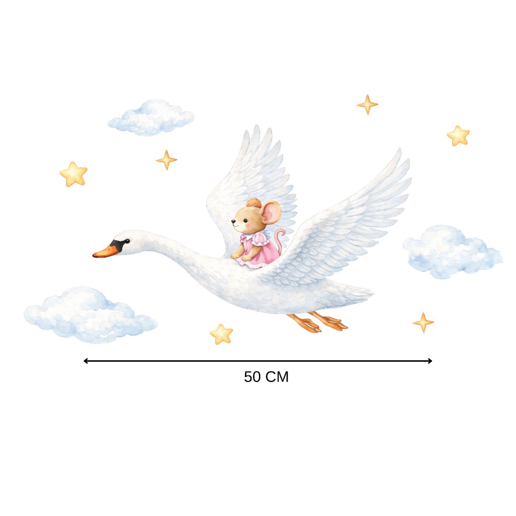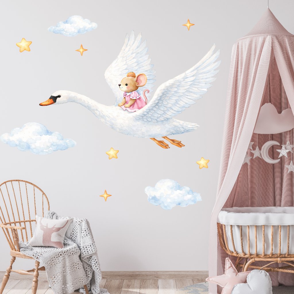 Vydejte se s myškou na kouzelný let na labuti a proměňte dětský pokoj v pohádkový svět plný fantazie. Tato samolepka je ideální pro malé holčičky, které milují jemné pohádky, nebe, hvězdy a snové příběhy před spaním.