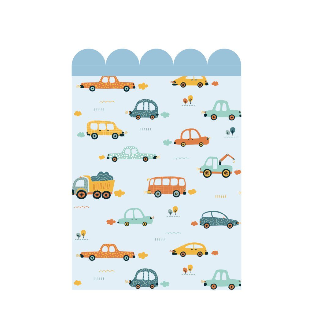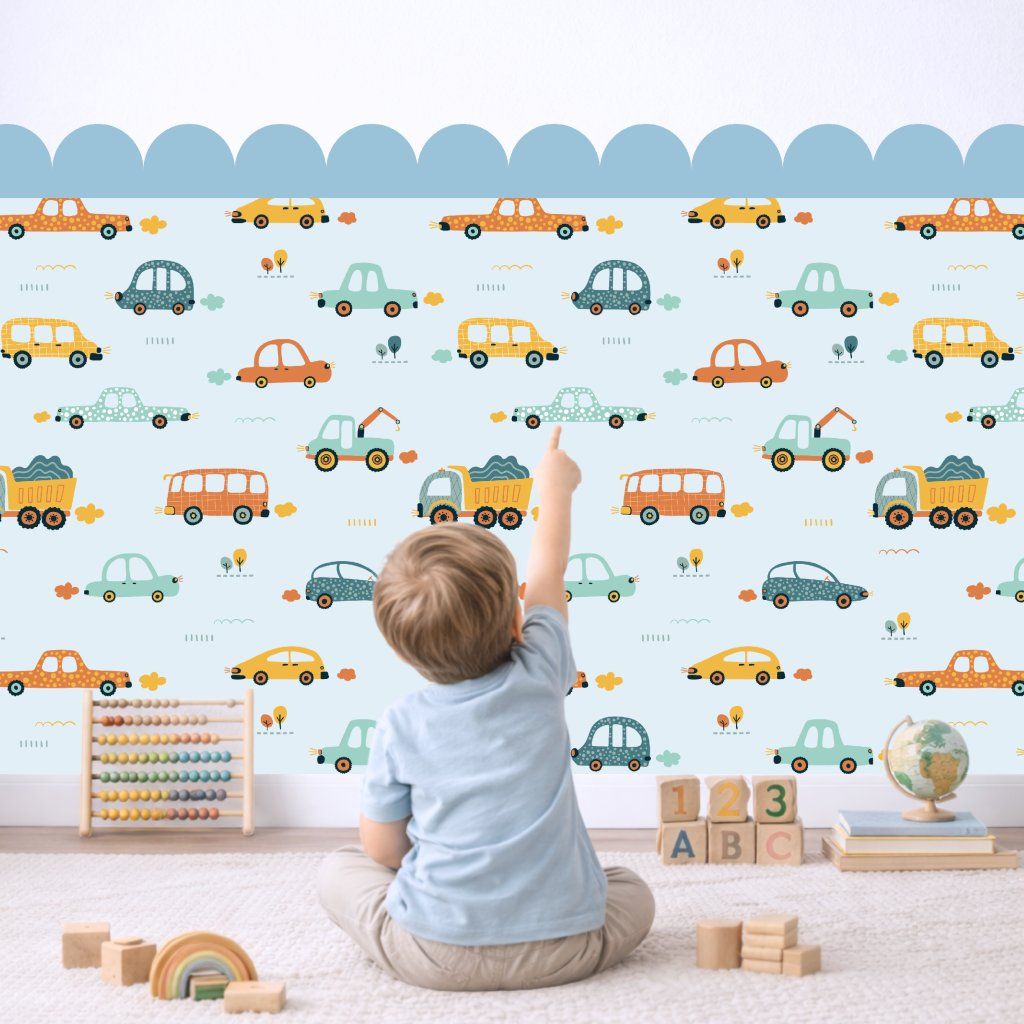 Proměňte pokojíček v hravý svět plný autíček s obloukovou dekorací v jemných barvách, která dodá stěně dynamiku a radost.