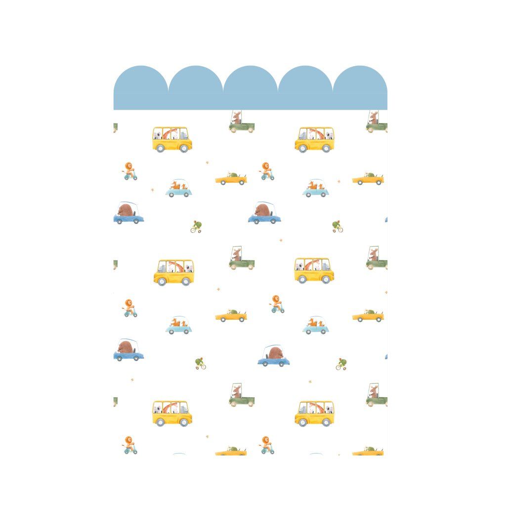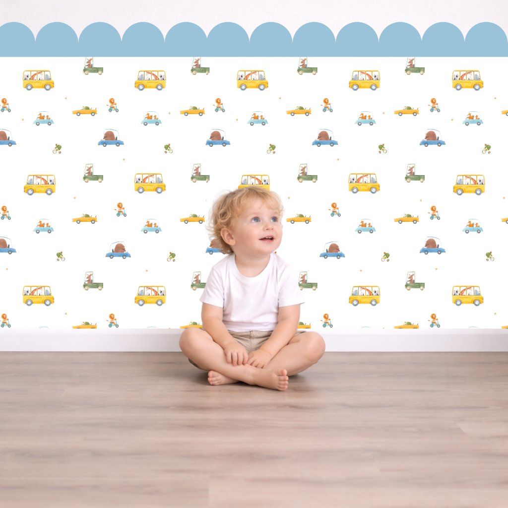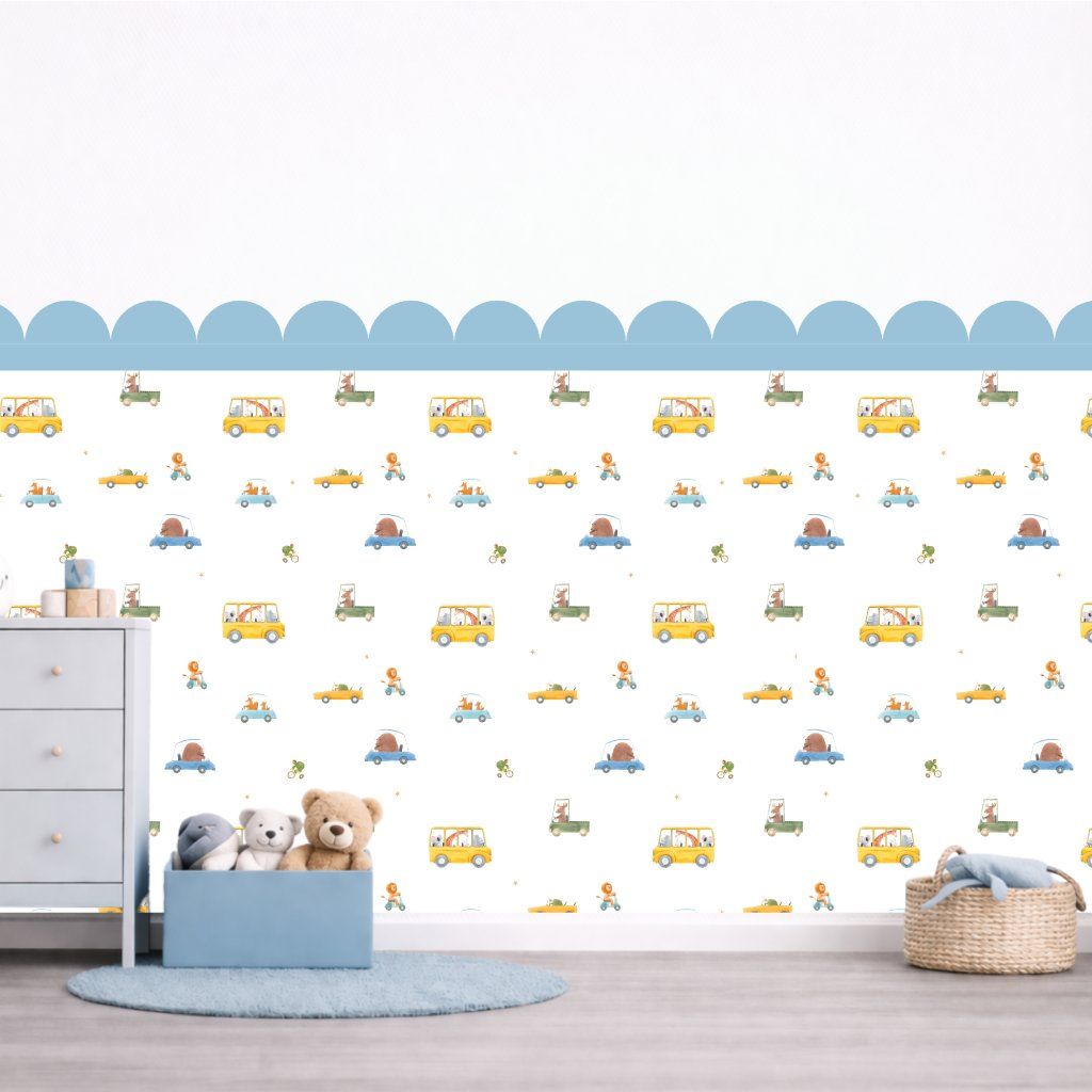 Vykouzlete hravý svět s obloukovou dekorací plnou roztomilých autíček se zvířátky, která dodá stěně jemný a veselý nádech.