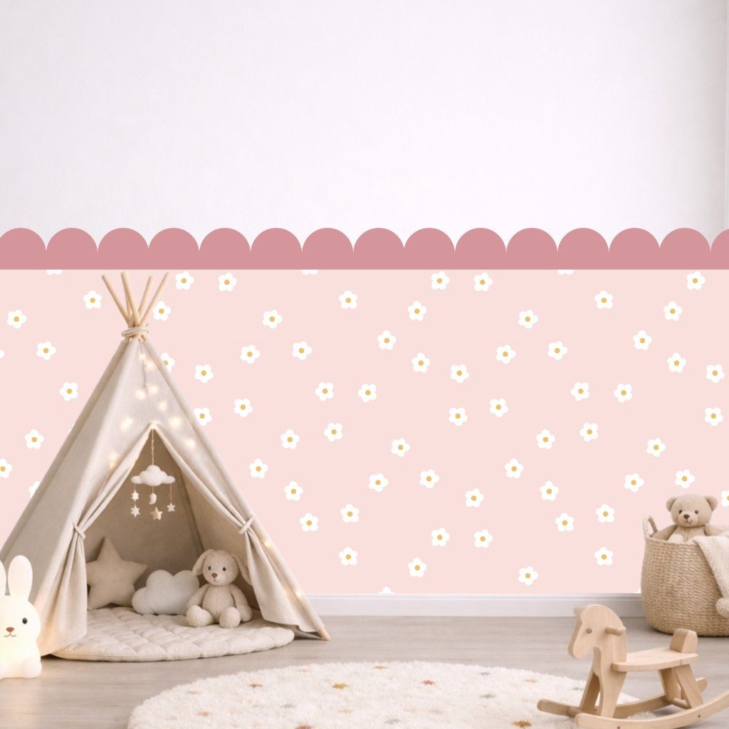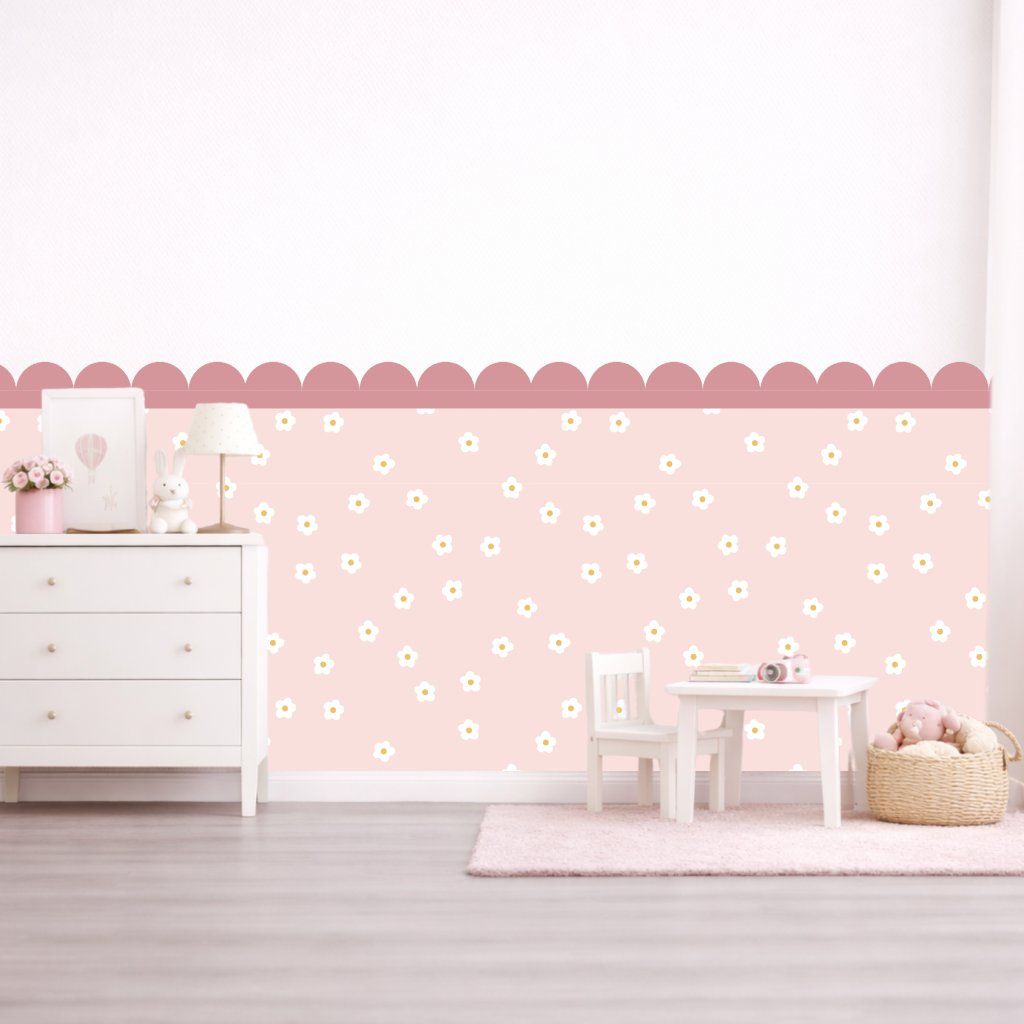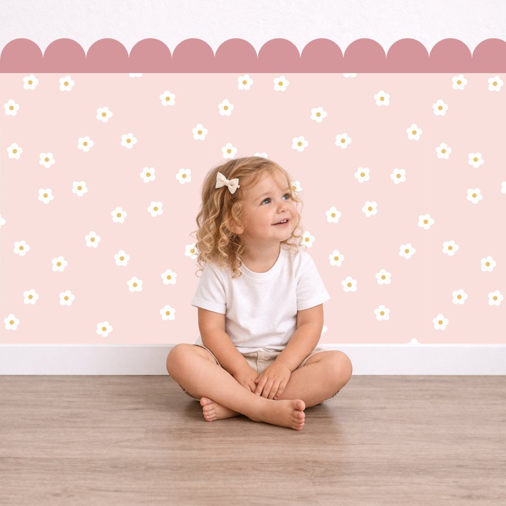 Proměňte stěnu v něžný květinový prostor s dekorativními oblouky s drobnými kvítky v jemných pastelových tónech, který působí čistě a harmonicky.