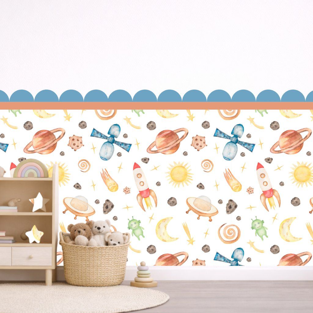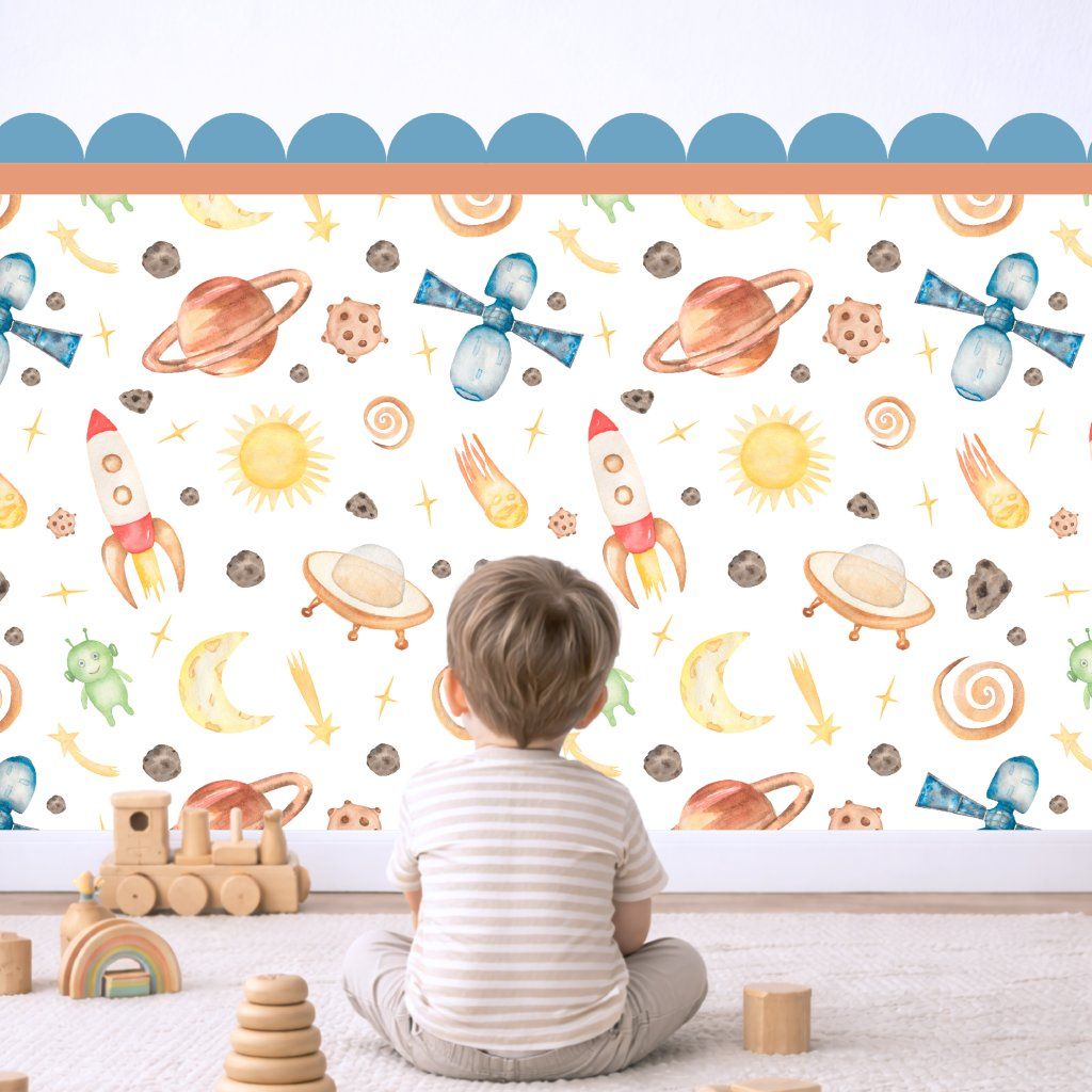 Vneste do pokojíčku dobrodružství s vesmírnými motivy raket, planet a hvězd v hravém akvarelovém stylu.