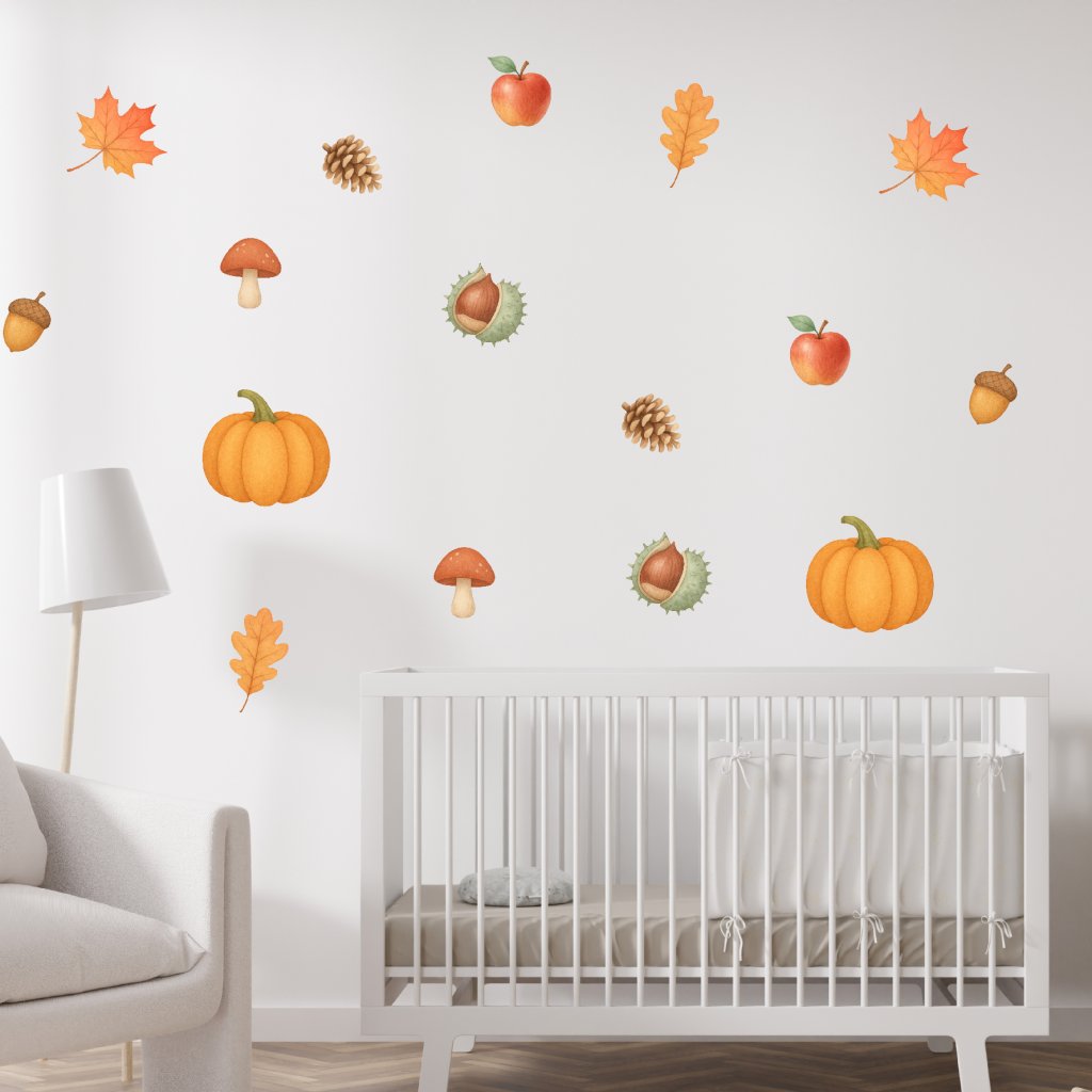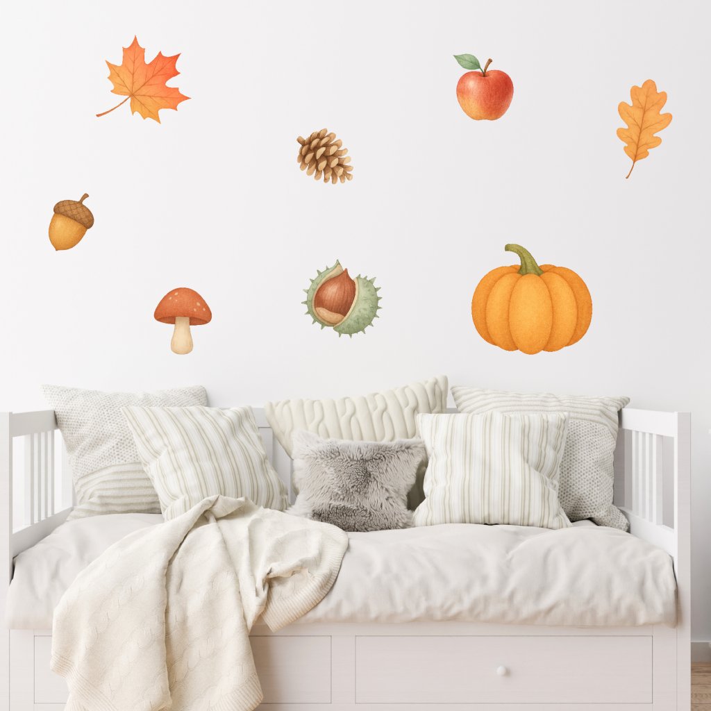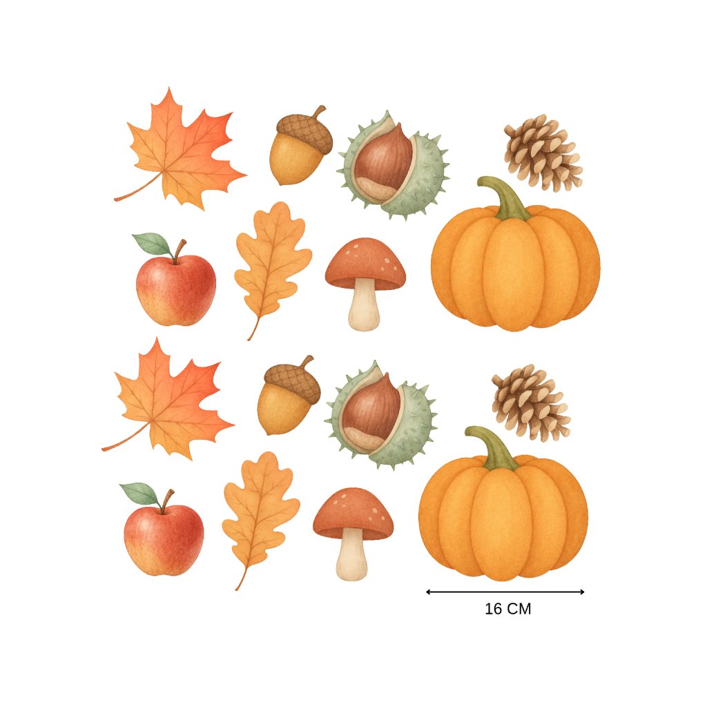 Vneste do pokoje kouzlo podzimu! Tato sada samolepek s dýněmi, jablíčky, žaludy, listy, kaštany, houbami a šiškami vytvoří útulnou atmosféru plnou barev a přírody. Ideální sezónní dekorace, která rozzáří prostor a podpoří dětskou fantazii. 🍂🍁