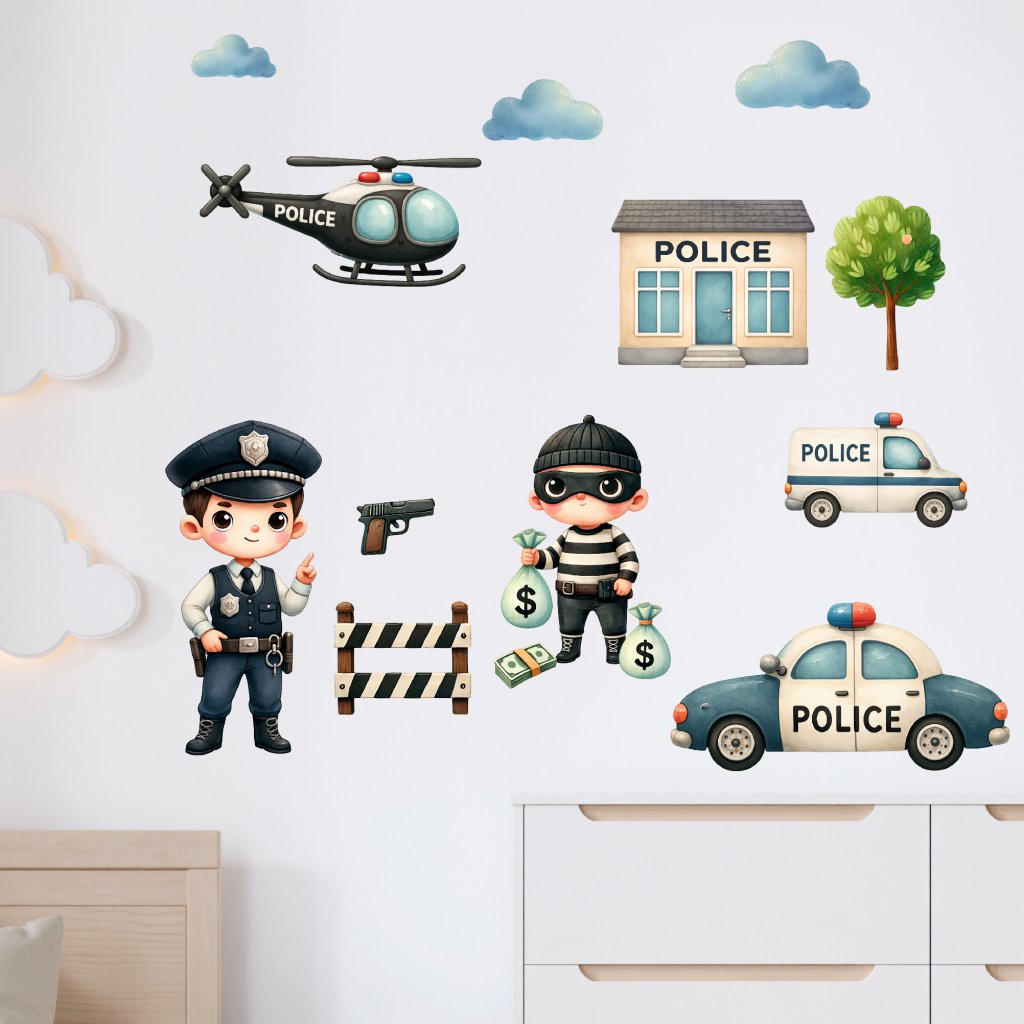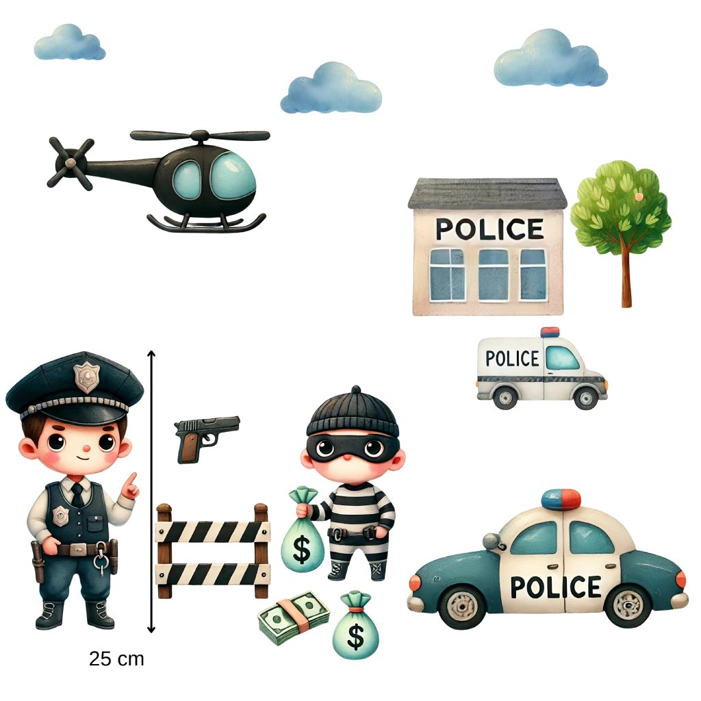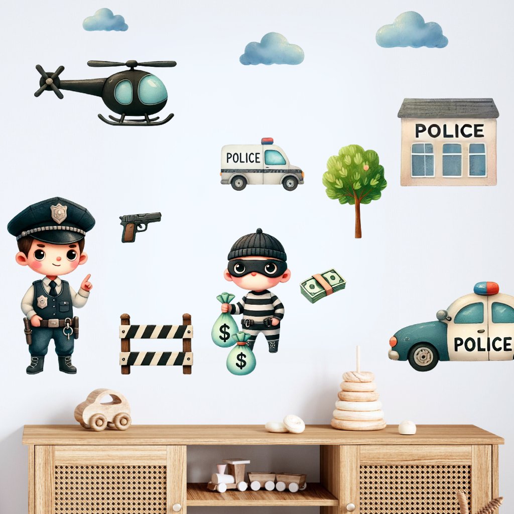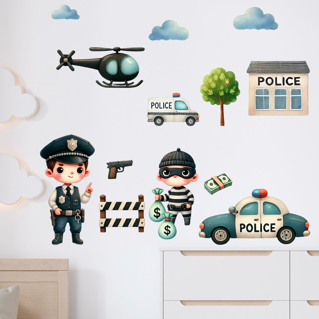 Kdo by si nechtěl zahrát na statečného policistu a chytit lumpa přímo ve svém pokojíčku? Samolepky s policejní tematikou – včetně auta, helikoptéry, stanice i zloděje – jsou perfektní pro malé strážce pořádku, kteří milují dobrodružství a akci.