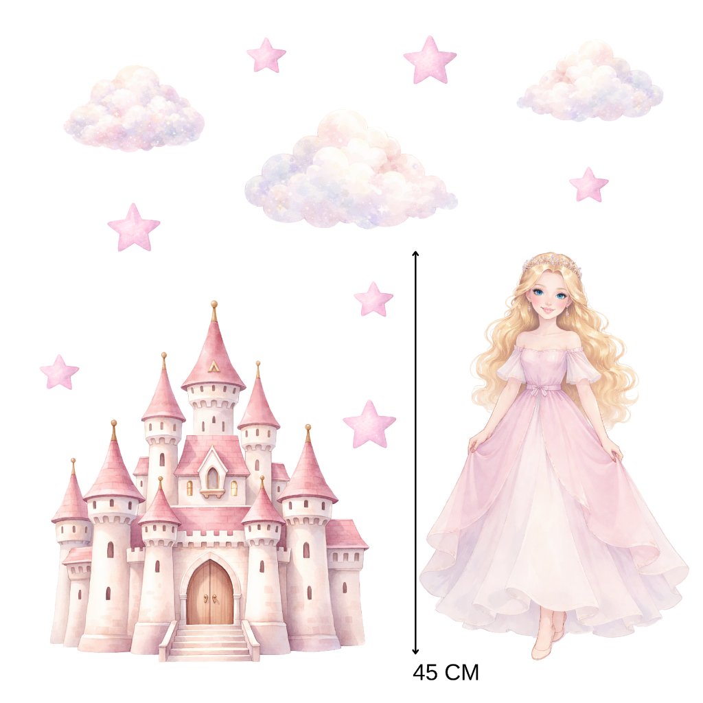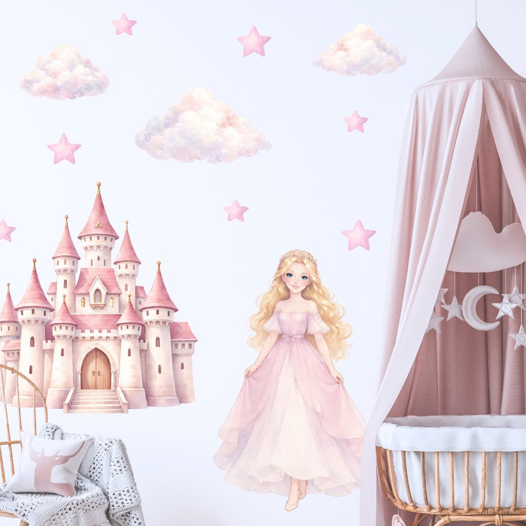Pohádková princezna, kouzelný zámek, obláčky a hvězdičky promění dětský pokoj v něžný pohádkový svět. Ideální pro malé princezny a milovnice pohádek. 👑✨🏰