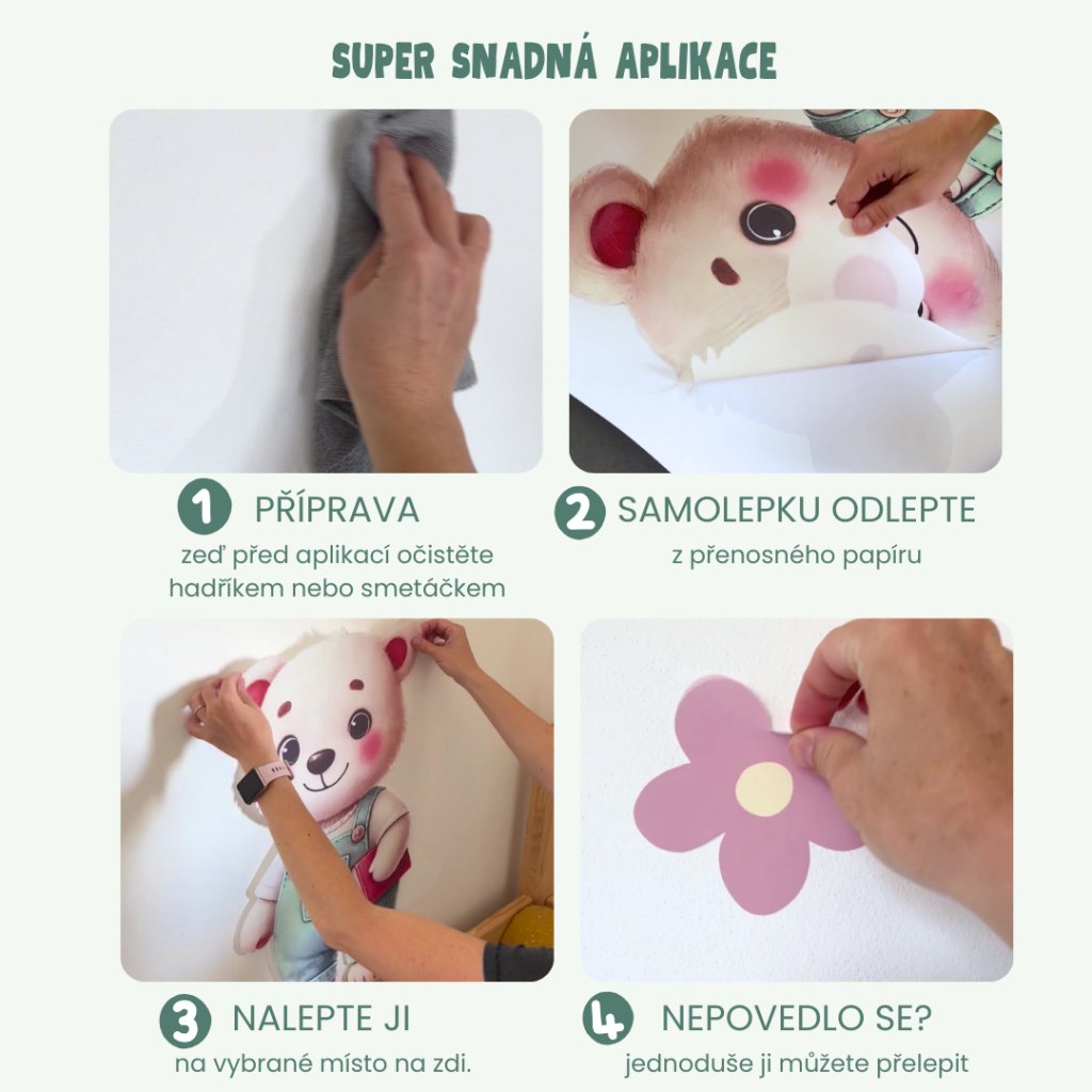 - Samolepky nejsou hračka. Přelepování je určeno k úpravě polohy samolepky, přemístění při stěhování či malování pokoje.