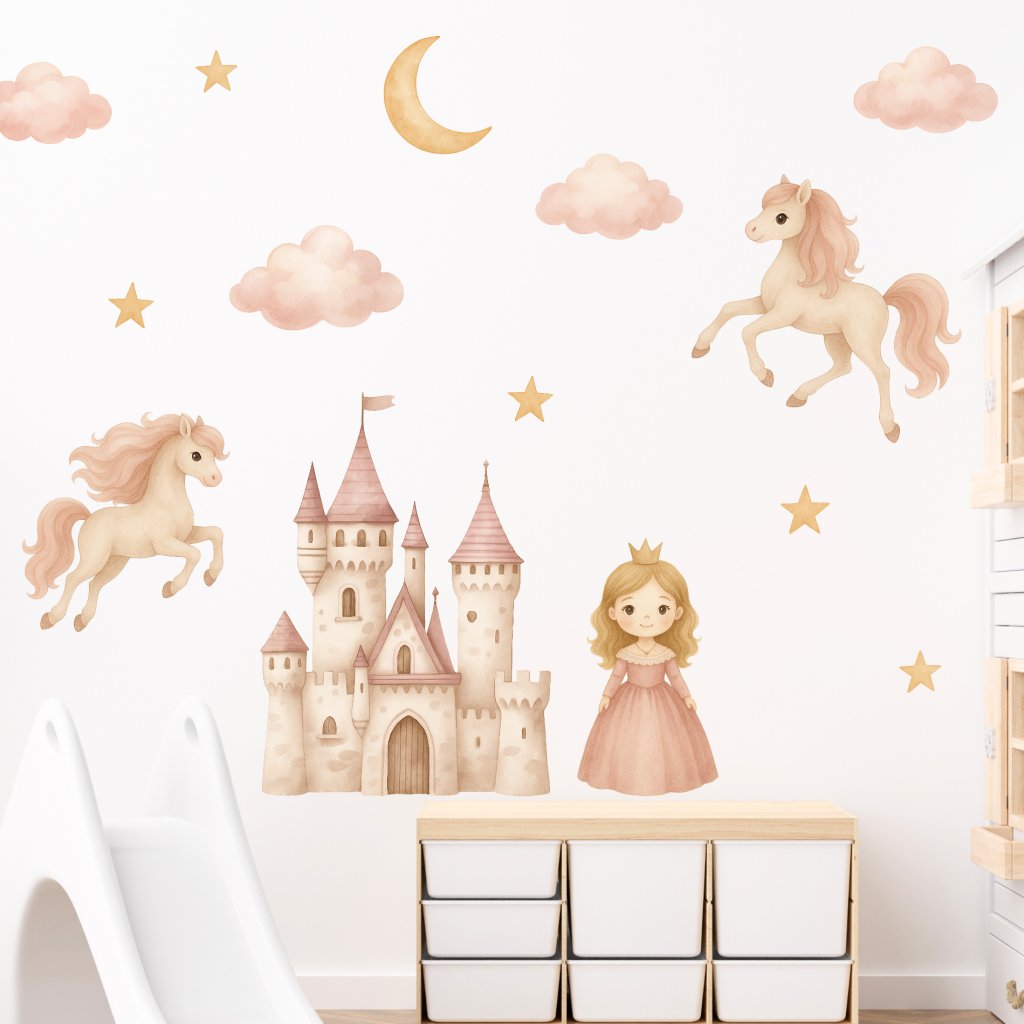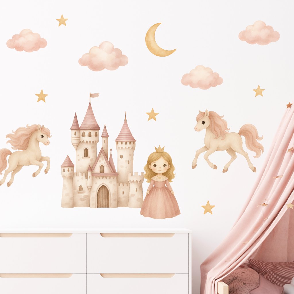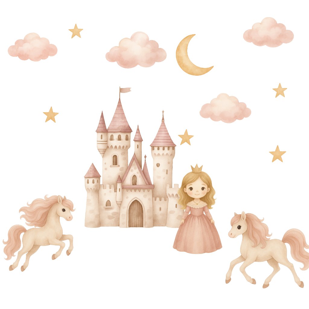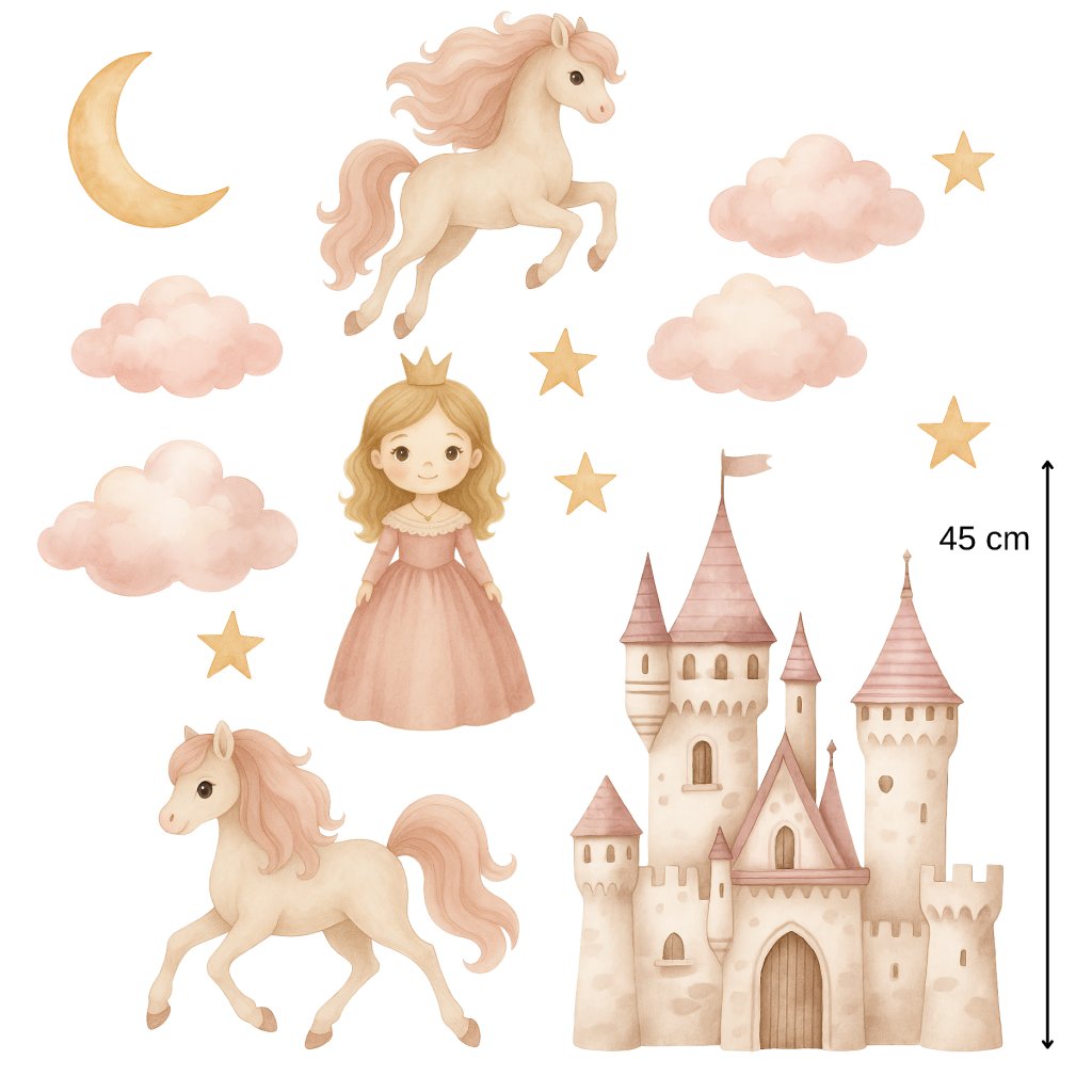 Proměňte dětský pokoj v kouzelnou pohádku! Samolepky s princeznou, hradem, hvězdami a roztomilými koníky vykouzlí kouzelnou atmosféru pro všechny malé princezny a milovnice pohádek. 🌸🦄🏰