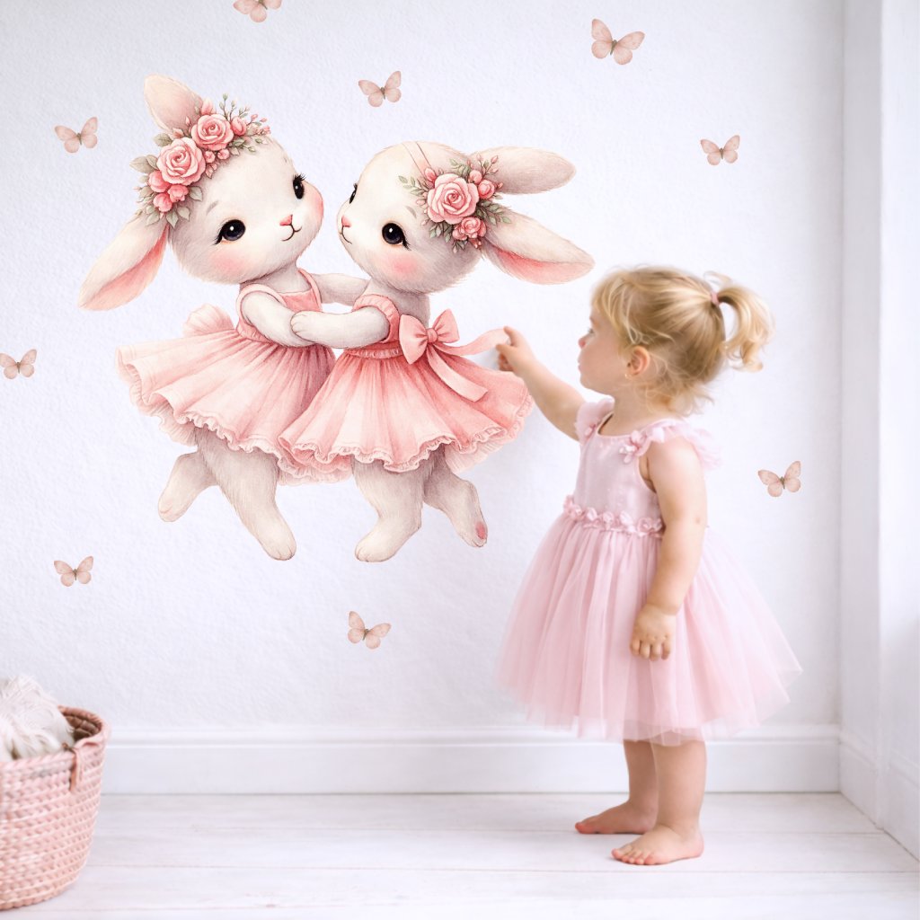 Roztočte to v dětském pokojíčku s těmito kouzelnými samolepkami dvou tančících králíčků v něžných šatičkách! Ideální pro malé baletky a snílky, kteří milují pohádky, zvířátka a jemný romantický styl.