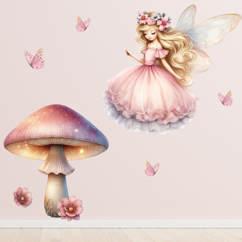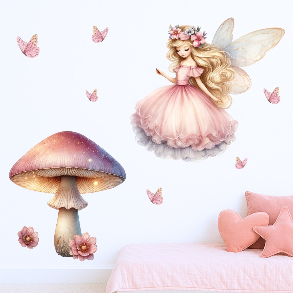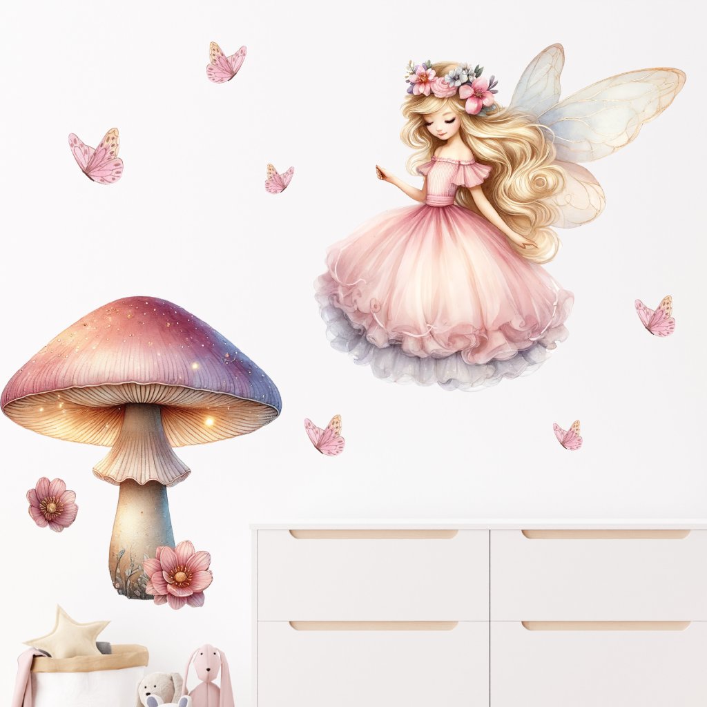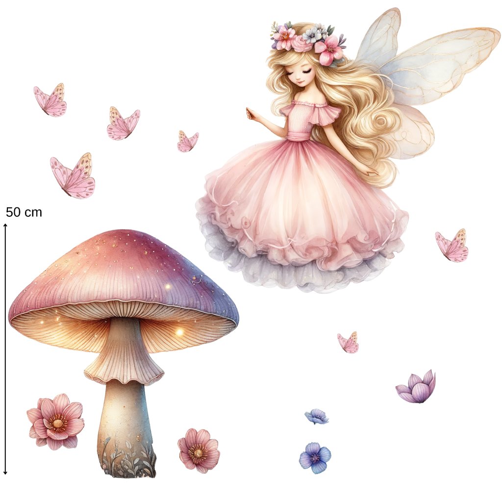 Vneste do dětského pokojíčku kouzlo pohádkového lesa! Jemná víla s rozpuštěnými vlasy, třpytivá houbička a poletující motýlci vytvoří snovou dekoraci, která promění pokoj v kouzelné místo plné fantazie a klidu.