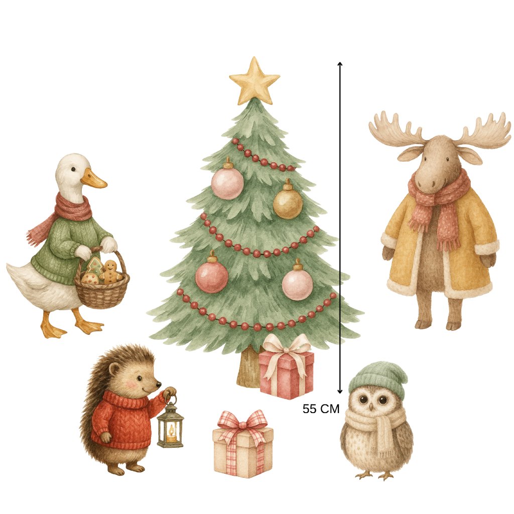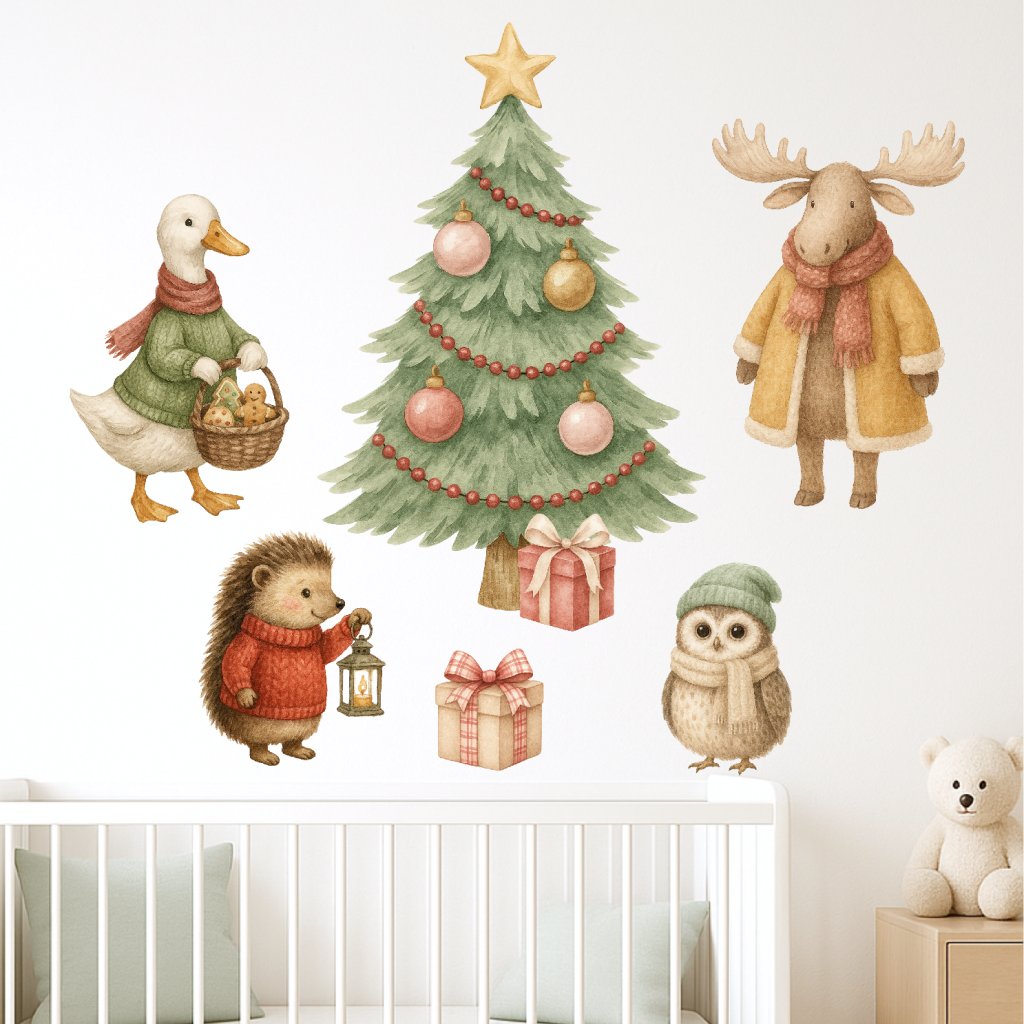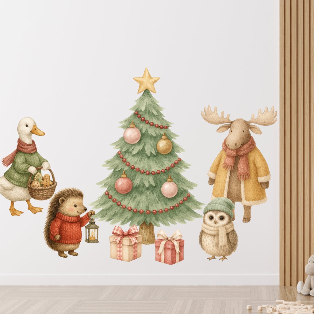 Zvířátka u vánočního stromečku - přelepitelné dětské samolepky na zeď