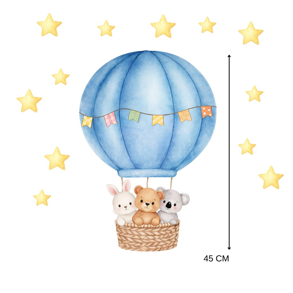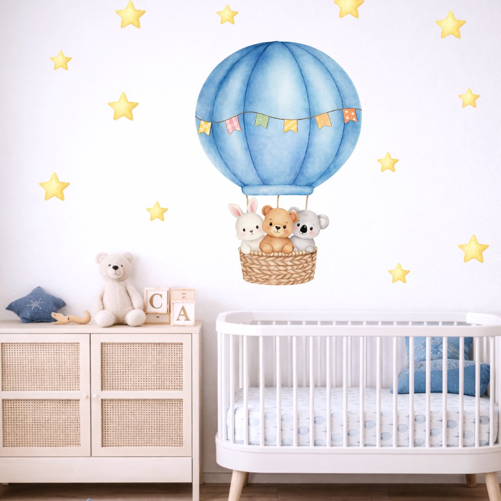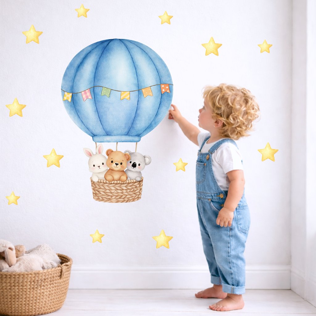 Zvířátka v modrém balonu - přelepitelné samolepky na zeď